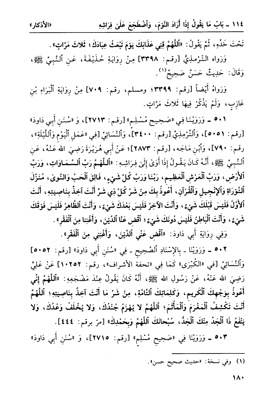 502- وروينا -بالإِسناد الصحيح- في "سنن أبي داود" [رقم: 5052] والنسائي [في "الكبرى" كما في "تحفة الأشراف"، رقم: 10252] عن عليّ رضي الله عنه، عن رسول الله صلى الله عليه وسلم أنه كان يقول عند مضجعه: "اللَّهُمَّ إني أعُوذُ بِوَجْهِكَ الكَرِيمِ، وَكَلِماتِكَ التَّامَّة، من شر ما أنت آخذ بناصيته، اللَّهُمّ أنْتَ تَكْشِفُ المَغْرَمَ والمَأثمَ، اللَّهُمَّ لا يُهْزَمُ جُنْدُكَ، وَلا يُخْلَفُ وَعْدُكَ، ولا ينفع ذا الجد منك الجد، سُبْحانَكَ اللَّهُمَّ وبِحَمْدِكَ" [مر برقم: 444] .