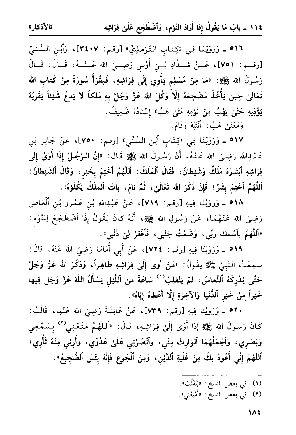 518- وروينا فيه [رقم: 719] ، عن عبد الله بن عمرو بن العاص رضي الله عنهما، عن رسول الله -صلى الله عليه وسلم- أنه كان يقولُ إذا اضجع للنوم: "اللَّهُمَّ باسْمِكَ رَبي، وَضَعْتُ جَنْبِي، فاغْفِرْ لي ذَنْبِي".