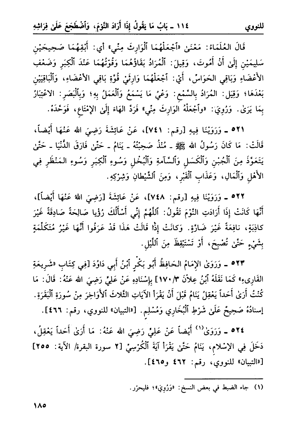 523- وروى الإِمام الحافظ أبو بكر بن أبي داود [في كتاب "شريعة القارئ" كما نقله ابن علان 170/3] بإسناده عن علي رضي الله عنهُ: قال: ما كنتُ أرى أحداً يعقلُ ينامُ قبل أن يقرأ الآيات الثلاث الأواخر من سورة البقرة. إسنادهُ صحيحٌ على شرط البخاري ومسلمٍ. ["التبيان" للنووي، رقم: 466] .