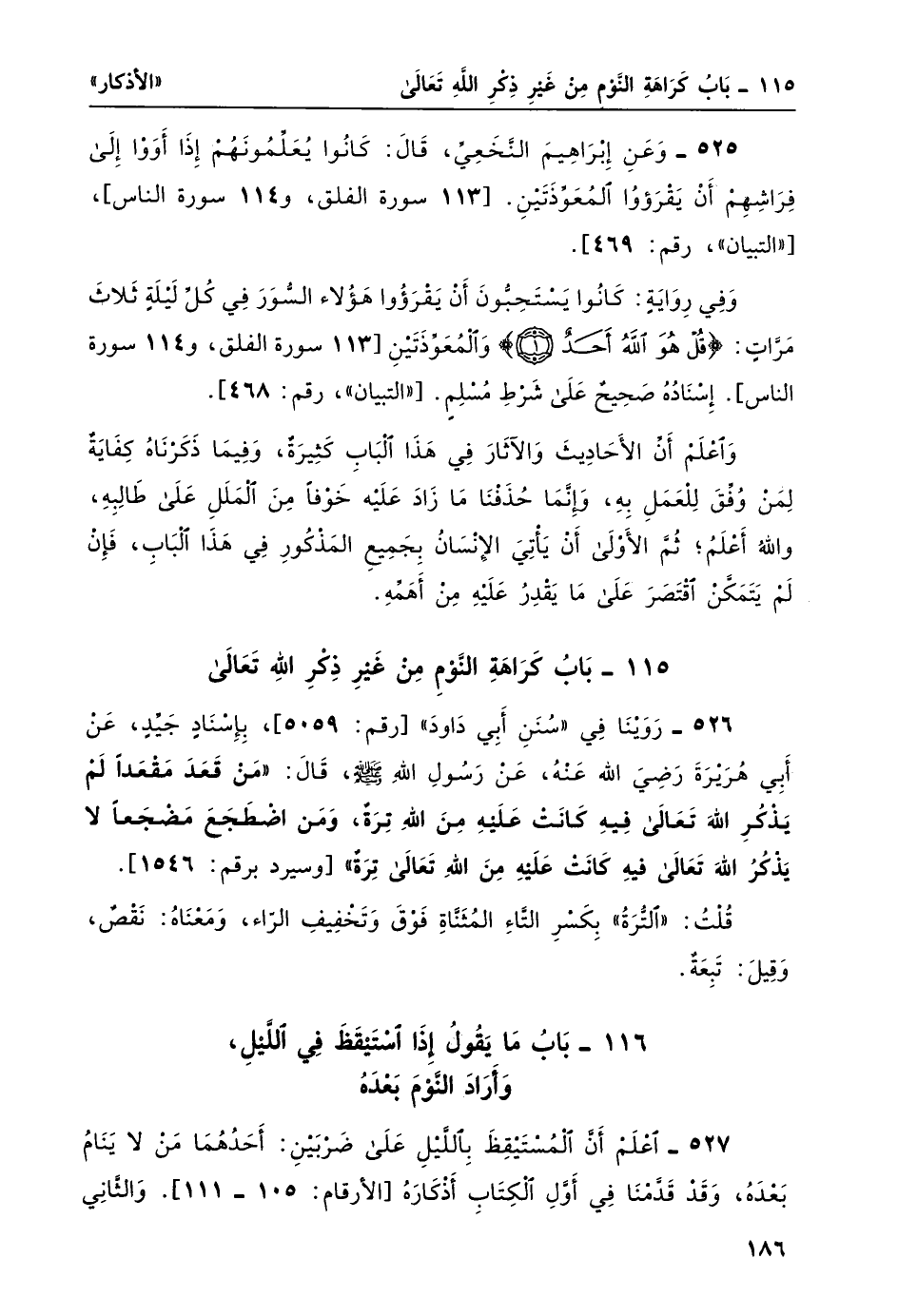 525- وعن إبراهيم النخعي، قال: كانوا يُعلّمونهم إذا أووا إلى فراشهم أن يقرءوا المعوذتين. [سورة الفلق، وسورة الناس] ، ["التبيان"، رقم: 469] .