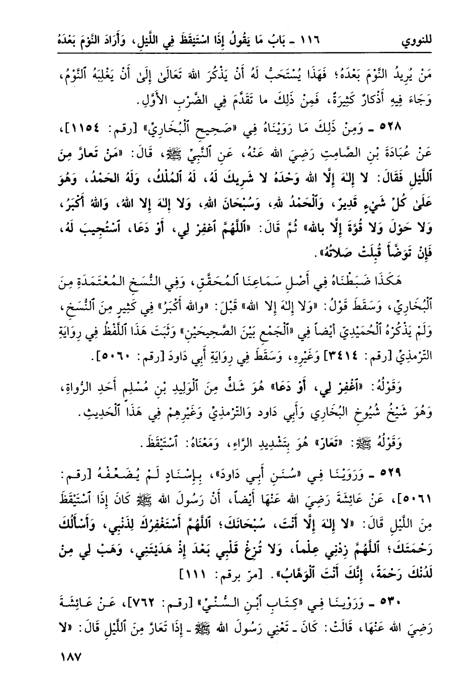 530- وروينا في "كتاب ابن السني" [رقم: 762] ، عن عائشة رضي الله عنها، قالت: كان -تعني رسول الله صلى الله عليه وسلم- إذا تعارّ من الليل قالَ: "لا