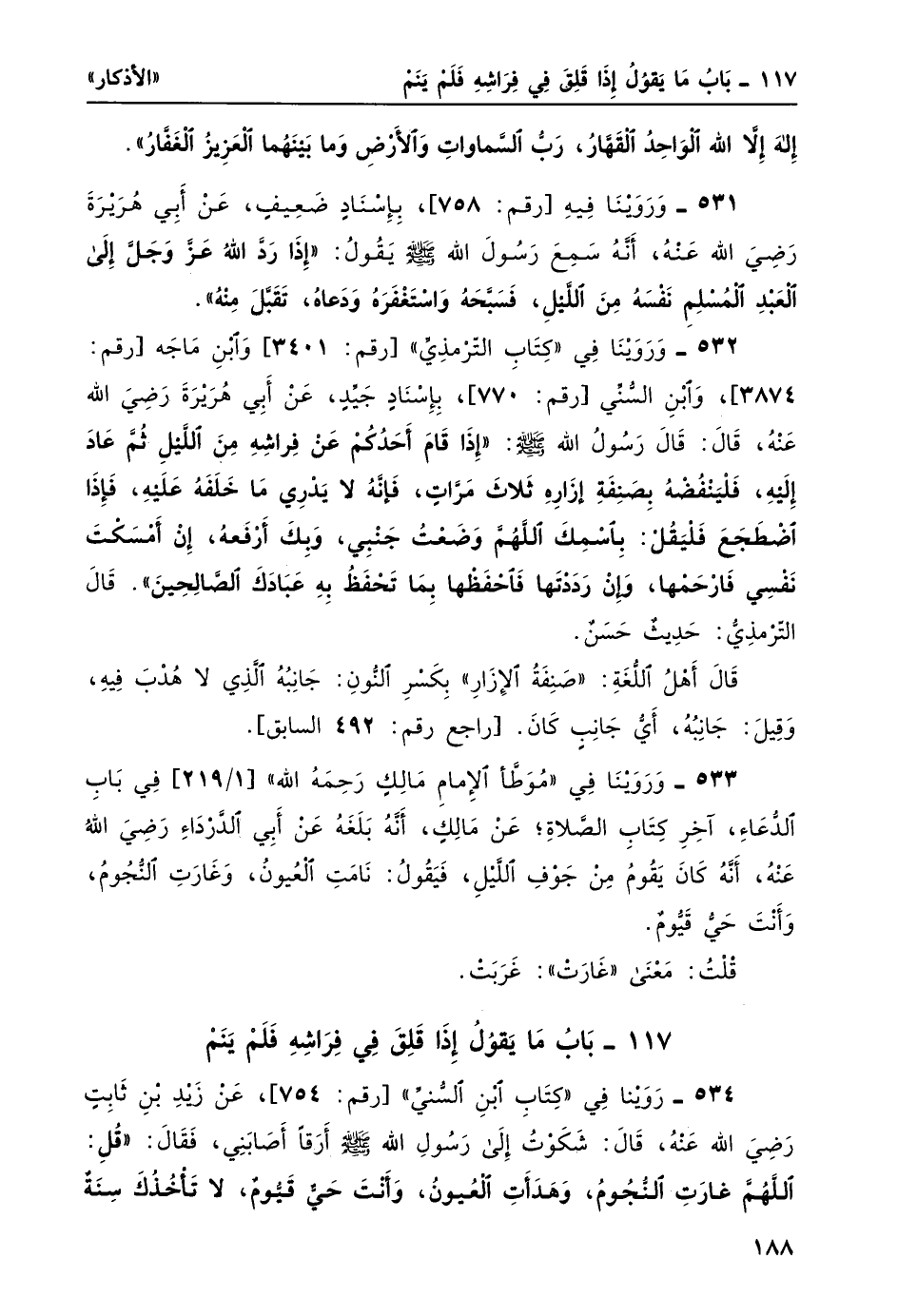 532- وروينا في "كتاب الترمذي" [رقم: 3401] وابن ماجه [رقم: 3874] ، وابن السني [رقم: 770] ، بإسناد جيد، عن أبي هريرة -رضي الله عنه- قال: قال رسول الله -صلى الله عليه وسلم: "إذا قام أحَدُكُمْ عَنْ فِرَاشِهِ مِنَ اللَّيْلِ ثم عادَ إِلَيْهِ، فَلْيَنْفُضْهُ بِصَنِفَةِ إِزَارِهِ ثَلاث مَرَّاتٍ، فإنَّهُ لا يَدْرِي ما خَلَفَهُ عَلَيْهِ، فإذَا اضْطَجَعَ فَلْيَقُلْ: باسْمِكَ اللَّهُمَّ وَضَعْتُ جَنْبِي، وَبِكَ أرفعهُ، إن أمسكت نَفْسِي فارْحَمْها، وَإِنْ رَدَدْتَها فاحْفَظْها بِما تَحْفَظُ بِهِ عِبادَكَ الصَّالِحين". قال الترمذي: حديث حسن.