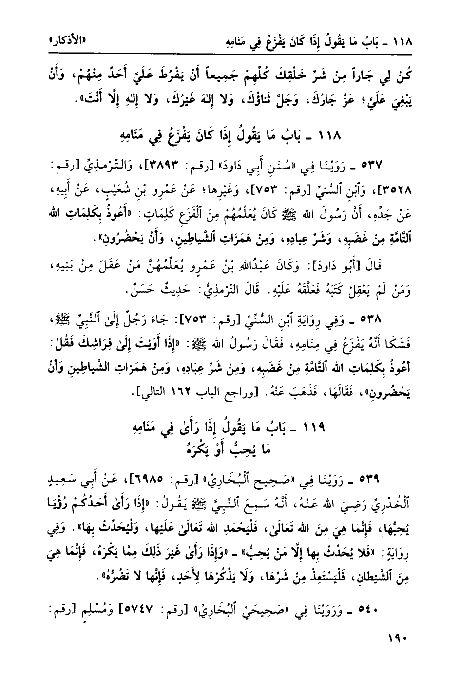 538- وفي رواية ابن السني [رقم: 753] : جاء رجلٌ إلى النبي -صلى الله عليه وسلم- فشكا أنه يفزعُ في منامه، فقالَ رسولُ الله -صلى الله عليه وسلم: "إذَا أوَيْتَ إلى فِرَاشِكَ فَقُلْ: أعوذُ بِكَلِماتِ اللَّهِ التَّامَّةِ مِنْ غضبه، ومن شر عباده، ومن همزات الشَّياطِينِ وأنْ يَحْضرُونِ"، فقالها، فذهب عنه. [وراجع الباب 162 التالي] .