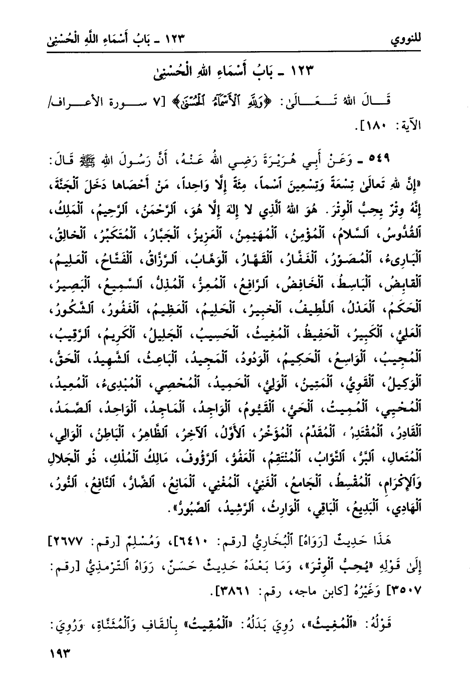 549- وعن أبي هريرة -رضي الله عنهُ- أن رسول الله -صلى الله عليه وسلم- قال: "إنَّ لِلَّهِ تَعالى تِسْعَةً وَتِسْعِينَ اسْماً، مائة إِلاَّ وَاحِداً، مَنْ أحْصَاها دَخَلَ الجَنَّةَ، إنه وترٌ يحبُ الوتر. هُوَ اللَّهُ الَّذي لا إِلهَ إِلاَّ هُوَ، الرَّحْمَنُ، الرَّحِيمُ، المَلِكُ، القُدُّوسُ، السلامُ، المؤمنُ، المهيمنُ، العَزِيزُ، الجَبَّارُ، المُتَكَبِّرُ، الخالِقُ، البارئ، المُصَوّرُ، الغفارُ، القهارُ، الوهابُ، الرزاقُ، الفتاحُ، العليمُ، القابضُ، الباسطُ، الخافضُ، الرافعُ، المُعِزُّ، المذلُ، السميعُ، البَصِيرُ، الحكمُ، العدلُ، اللطيفُ، الخبيرُ، الحليمُ، العظيمُ، الغفورُ، الشكورُ، العليُ، الكبيرُ، الحفيظُ، المغيثُ، الحَسِيبُ، الجليلُ، الكريمُ، الرقيبُ، المجيبُ، الواسعُ، الحكيمُ، الودودُ، المجيدُ، الباعثُ، الشهيدُ، الحقُ، الوكيلُ، القويُ، المتينُ، الوَليُّ، الحميدُ، المحصي، المبدئُ، المعيدُ، المُحْيِي، المميتُ، الحيُ، القَيُّومُ، الوَاجِدُ، الماجدُ، الواحدُ، الصمدُ، القادرُ، المقتدرُ، المقدمُ، المؤخرُ، الأولُ، الآخرُ، الظاهرُ، الباطنُ، الوَالي، المتعالِ، البَرُّ، التوابُ، المنتقمُ، العفوُ، الرؤوفُ، مالكُ الملكِ، ذُو الجلالِ وَالإِكْرَامِ، المقسطُ، الجامعُ، الغَنِيُّ، المُغْنِي، المانعُ، الضَّار، النافعُ، النورُ، الهَادِي، البديعُ، الباقِي، الوَارِثُ، الرشيدُ، الصَّبُورُ".