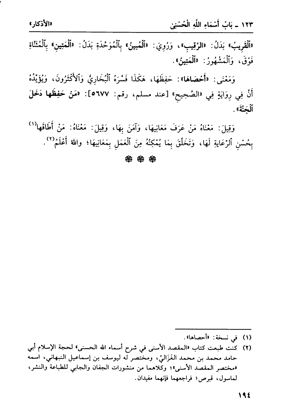 2 كنت طبعت كتاب "المقصد الأسنى في شرح أسماء الله الحسنى" لحجة الإسلام أبي حامد محمد بن محمد الغزالي، ومختصر له ليوسف بن إسماعيل النبهاني، اسمه "مختصر المقصد الأسني"؛ وكلاهما من منشروات الجفان والجابي للطباعة والنشر، لماسول، قبرص؛ فراجعهما فإنهما مفيدان.