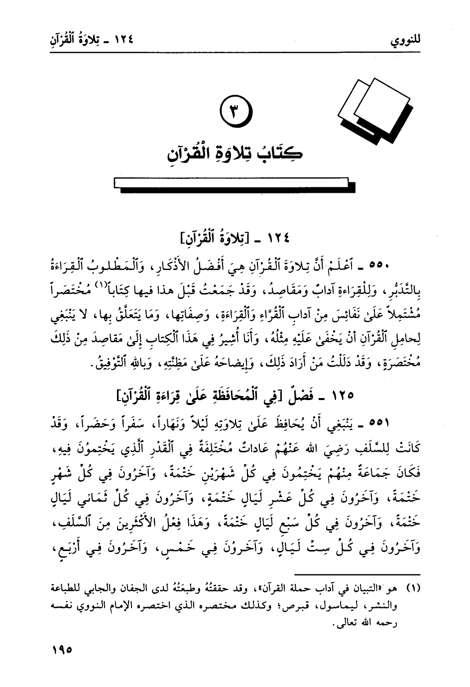 551- ينبغي أن يحافظ على تلاوته ليلاً ونهاراً، سَفَرًا وحَضَرًا، وقد كانت للسلف رضي الله عنهم عاداتٌ مختلفةٌ في القدر الذي يختمون فيه، فكان جماعةٌ منهم يختمون في كل شهرين ختمة، وآخرون في كل شهر ختمة، وآخرون في كل عشر ليال ختمة، وآخرون في كل ثماني ليالي ختمة، وآخرون في كل سبع ليالٍ ختمة، وهذا فعل الأكثرين من السلف، وآخرون في كل ستّ ليالٍ، وآخرون في خمس، وآخرون في أربع،