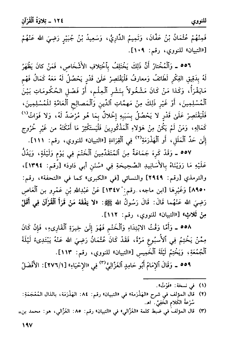 557- وقد كره جماعةٌ من المتقدمين الختم في يوم وليلة، ويدلّ عليه ما رويناهُ بالأسانيد الصحيحة في "سنن أبي داود" [رقم: 1394] ، والترمذي [رقم: 2949] والنسائي [في "الكبرى" كما في "التحفة"، رقم: 8950] وغيرها [ابن ماجه، رقم: 1347] عن عبد الله بن عمرو بن العاص -رضي الله عنهما- قال: قال رسولُ الله -صلى الله عليه وسلم: "لاَ يَفْقَهُ مَنْ قَرأ القُرآنَ فِي أقَلّ مِنْ ثَلاثٍ" ["التبيان" للنووي، رقم: 112] .