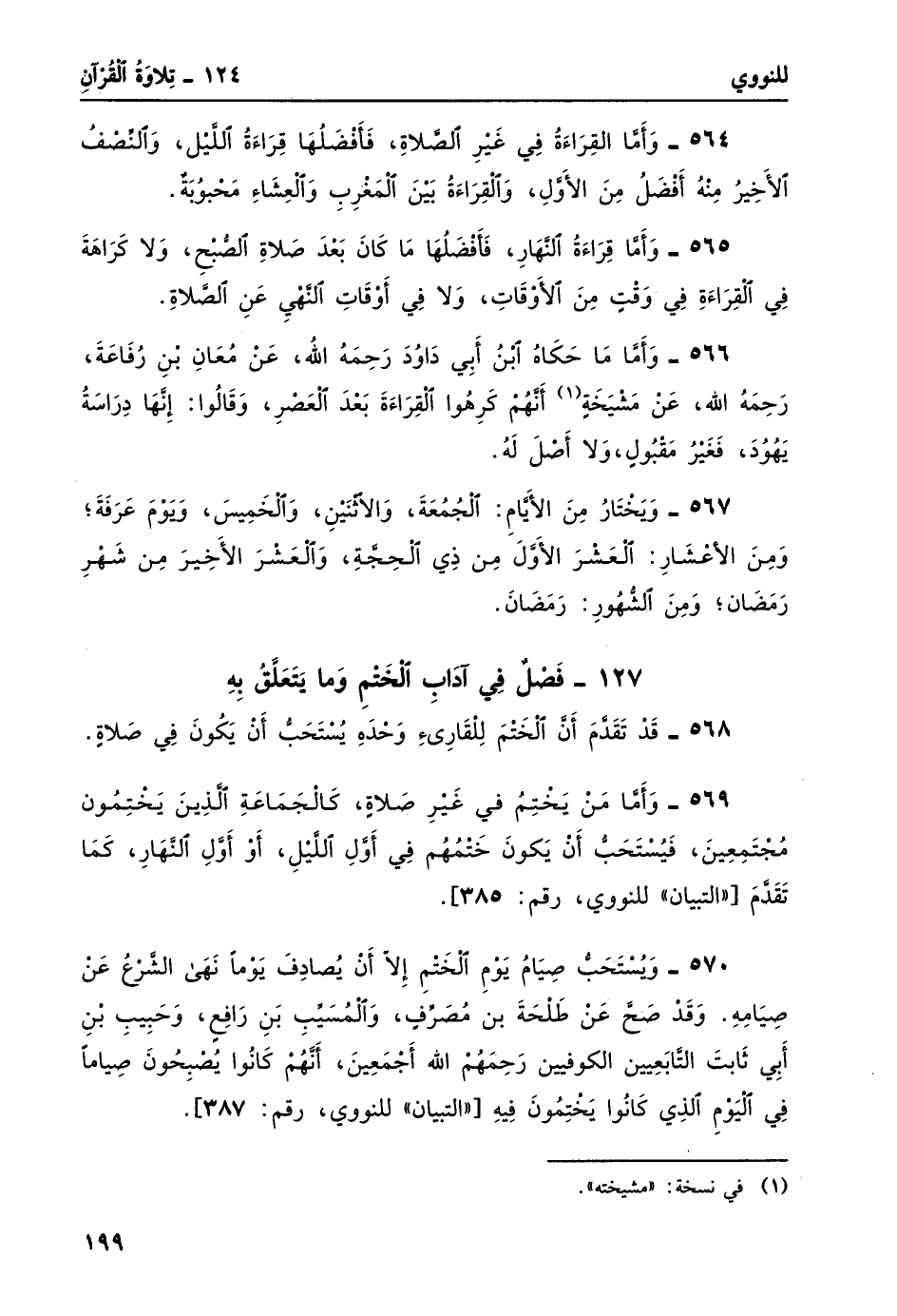 569- وأما من يختم في غير صلاةٍ، كالجماعةِ الذين يختمون مجتمعين، فيُستحبّ أن يكون ختمُهم في أوّل الليل، أو أوّل النهار، كما تقدم ["التبيان" للنووي، رقم: 385] .