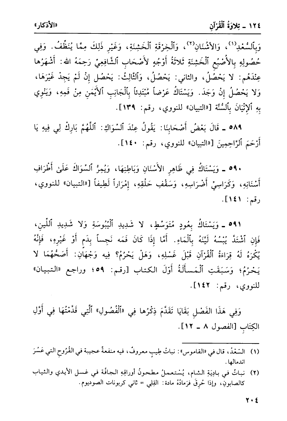 591- ويستاك بعود متوسط، لا شديد اليبوسة ولا شديد اللين، فإن اشتدّ يبسه ليَّنه بالماء. أما إذا كان فمه نجساً بدم أو غيره، فإنه يكره له قراءة القرآن قبل غسله، وهل يحرم؟ فيه وجهان: أصحُّهما لا يحرمُ؛ وسبقت المسألةُ أوّل الكتاب [رقم: 59؛ وراجع "التبيان" للنووي، رقم: 142] .