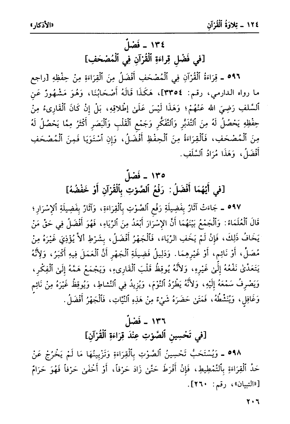 596- قراءة القرآن في المصحف أفضل من القراءة من حفظه [راجع ما رواه الدارمي، رقم: 3354] ، هكذا قاله أصحابنا، وهو مشهورٌ عن السلف رضي الله عنهم؛ وهذا ليس على إطلاقه، بل إن كان القارئ من حفظه يحصل له من التدبر والتفكّر وجمع القلب والبصر أكثرُ مما يحصلُ له من المصحف، فالقراءة من الحفظ أفضلُ، وإن استويا فمن المصحف أفضل، وهذا مراد السلف.