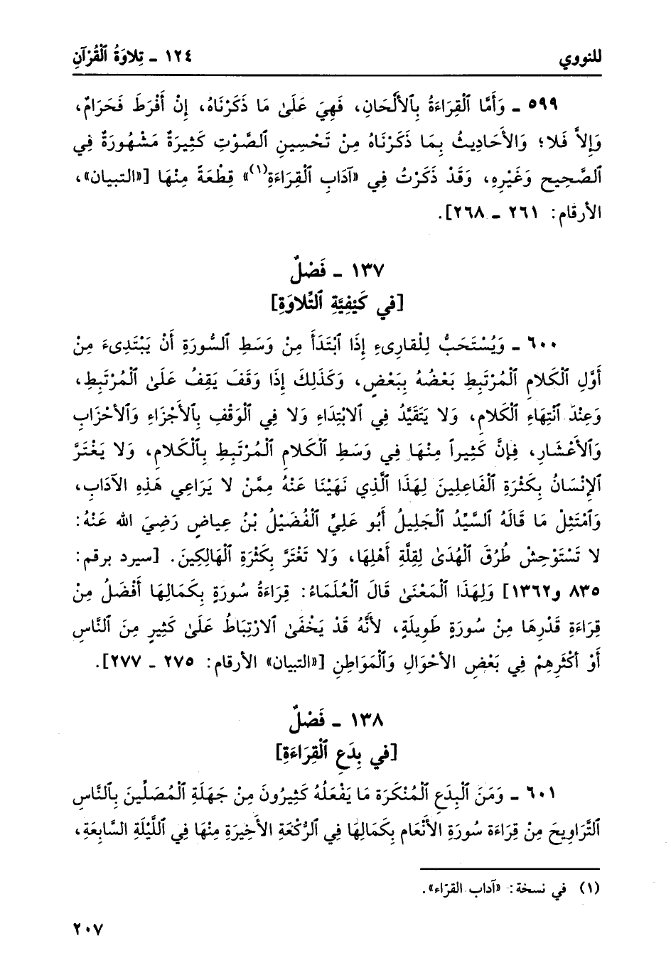 600- ويستحب للقارئ إذا ابتدأ من وسط السورة أن يبتدئ من أوّل الكلام المرتبط بعضه ببعض، وكذلك إذا وقفَ يقفَ على المرتبط، وعند انتهاء الكلام، ولا يتقيّدُ في الابتداء ولا في الوقف بالأجزاء والأحزاب والأعشار، فإن كثيراً منها في وسط الكلام المرتبط بالكلام، ولا يغترُّ الإِنسانُ بكثرةِ الفاعلين لهذا الذي نهينا عنه ممّن لا يُراعِي هذه الآداب، وامتثِلْ ما قاله السيد الجليل أبو عليّ الفُضَيْل بن عياض رضي الله عنه: لا تستوحشْ طرقَ الهدى لقلّة أهلها، ولا تغترّ بكثرة الهالكين. [سيرد برقم: 835 و1362] ولهذا المعنى قال العلماءُ: قراءة سورةٍ بكمالها أفضل من قراءة قدرها من سورة طويلة؛ لأنه قد يخفى الارتباط على كثير من الناس أو أكثرهم في بعض الأحوال والمواطن ["التبيان" الأرقام: 275 - 277] .