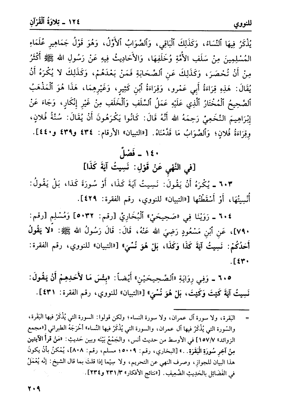 604- روينا في "صحيحي" البخاري [رقم: 5032] ومسلم [رقم: 790] ، عن ابن مسعود رضي الله عنه، قال: قال رسولُ الله صلى الله عليه وسلم: "لا يَقُولُ أحَدُكُمْ: نَسِيتُ آيَةَ كَذَا وَكَذَا، بَلْ هُوَ نُسِّي" ["التبيان" للنووي، رقم الفقرة: 430] .