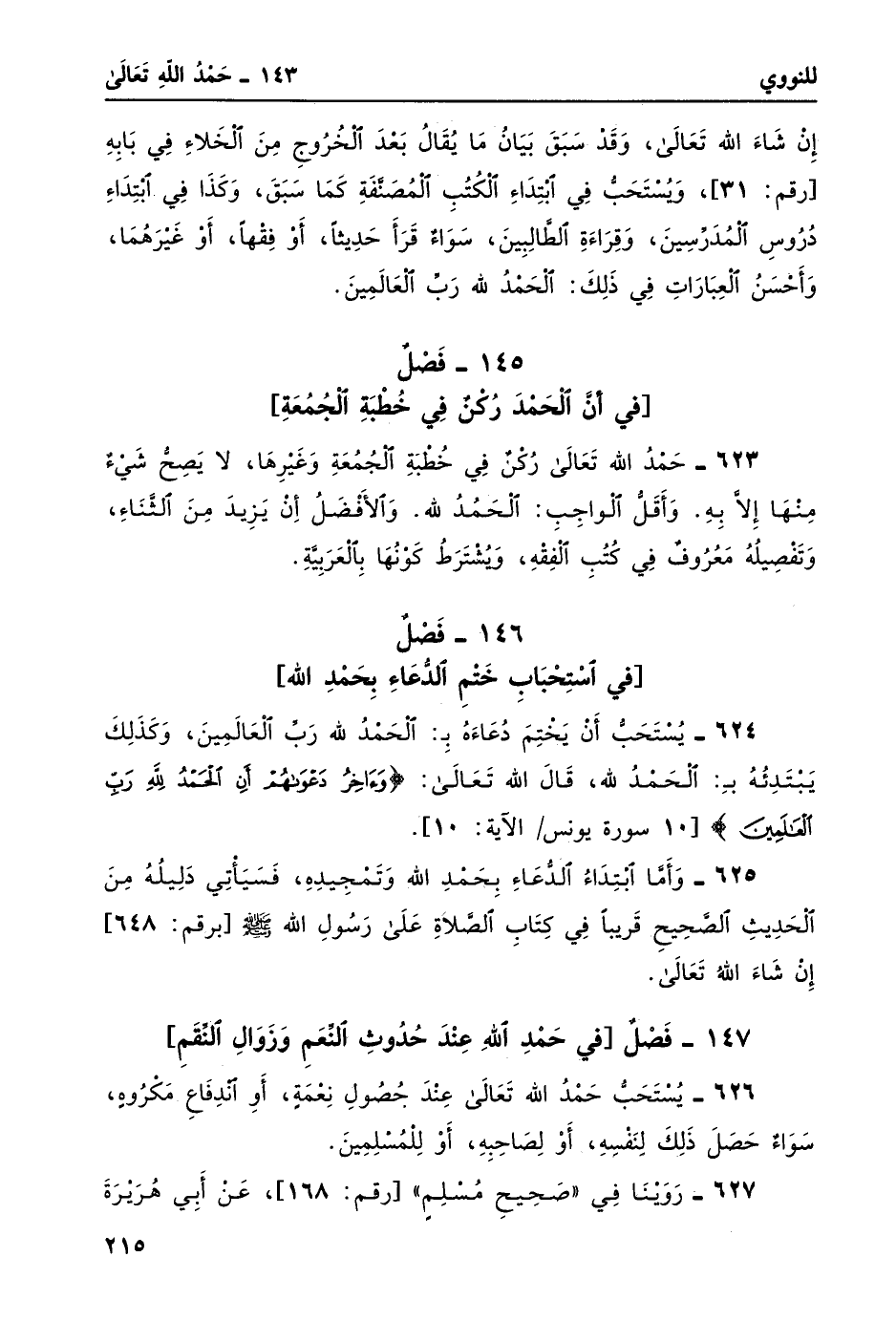 626- يُستحبّ حمدُ الله تعالى عند حصول نعمةٍ، أو اندفاع مكروهٍ، سواءٌ حصل ذلك لنفسه، أو لصاحبه، أو للمسلمين.