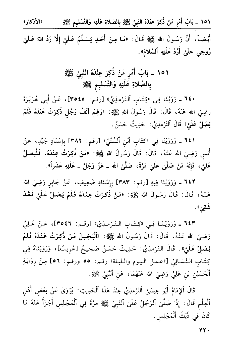 640- روينا في "كتاب الترمذي" [رقم: 3545] ، عن أبي هريرة رضي الله عنه، قال: قال رسوُ الله صلى الله عليه وسلم: "رَغِمَ أنْفُ رجلٍ ذكرتُ عندهُ فَلَمْ يصلِّ عَليَّ" قال الترمذي: حديثٌ حسنٌ.