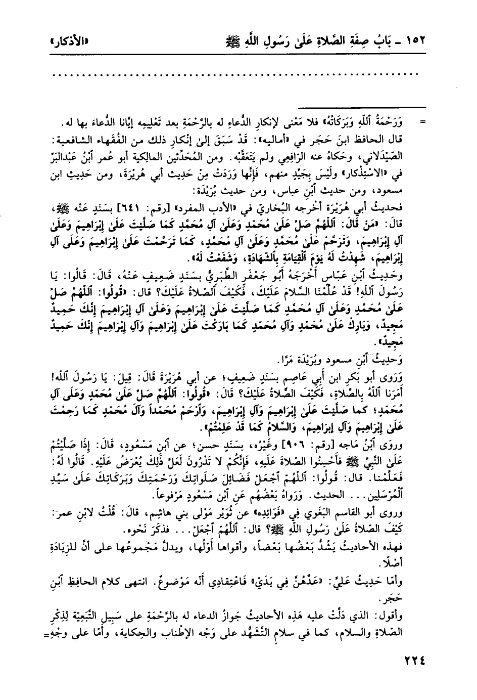 = ورحمة الله وبركاته" فلا معنى لإنكار الدعاء له بالرحمة بعد تعليمه إيّانا الدعاء بها له. قال الحافظ ابن حجر في "أماليه": قد سبق إلى إنكار ذلك من الفقهاء الشافعية: الصيدلاني، وحكاهُ عند الرافعي ولم يتعقبه. ومن المحدثين المالكية أبو عمر بن عبد البر في "الاستذكار" وليس يجيد منهم، فإنها وردت من حديث أبي هريرة، ومن حديث ابن مسعود، ومن حديث ابن عباس، ومن حديث بريدة: