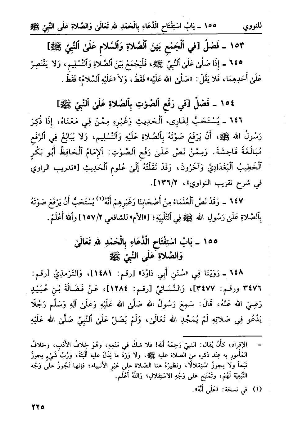 646- يُستحب لقارئ الحديث وغيره ممّن في معناهُ، إذا ذُكر رسولَ الله صلى الله عليه وسلم، أن يرفَعَ صوتهُ بالصلاة عليه والتسليم، ولا يبالغ في الرفع مبالغة فاحشة. وممّن نصّ على رفع الصوت: الإمامُ الحافظ أبو بكر الخطيب البغدادي وآخرون، وقد نقلتُه إلى علوم الحديث ["تدريب الراوي في شرح تقريب النواوي"، 136/2] .
