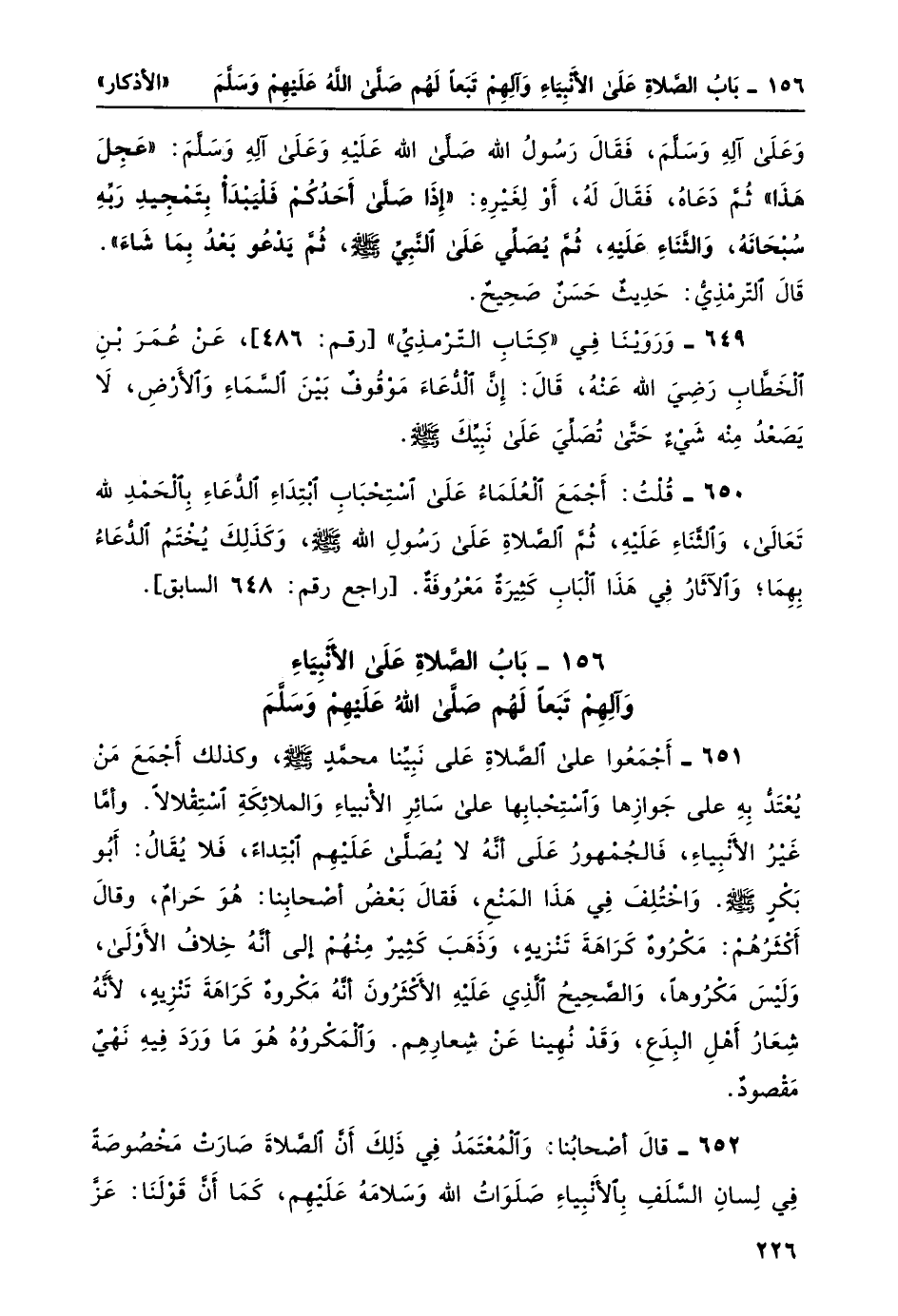 651- أجمعوا على الصلاة على نبيّنا محمّدٌ صلى الله عليه وسلم، وكذلك أجمع من يُعتّد به على جوازها واستحبابها على سائر الأنبياء والملائكة استقلالاً. وأما غيرُ الأنبياء، فالجمهور على أنه لا يُصلّى عليهم ابتداء، فلا يقالُ: أبو بكر صلى الله عليه وسلم. واختُلف في هذا المنع، فقال بعض أصحابنا: هو حرامٌ، وقال أكثرهم: مكروهٌ كراهةَ تنزيهٍ، وذهب كثيرٌ منهم إلى أنهُ خلافُ الأوْلَى، وليس مكروهاً، والصحيحُ الذي عليه الأكثرون أنه مكروهٌ كراهةَ تنزيه؛ لأنه شعارُ أهل البدع، وقد نُهينا عن شعارهم. والمكروهُ هو ما ورد فيه نهيٌ مقصود.