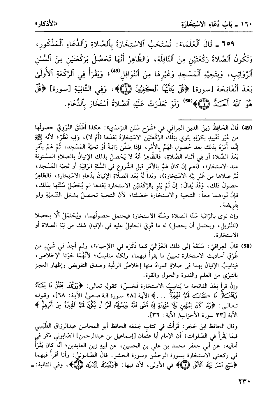 1 قال الحافظ زين الدين العراقي في "شرح سنن الترمذي": هكذا أطلق النووي حصولها من غير تقييد بكونه ينوي بتلك الركعتين الاستخارة بعدها "أم لا"، وفيه نظرٌ؛ لأنه صلى الله عليه وسلم إنما أمرهُ بذلك بعد حُصول الهم بالأمر، فإذا صلى راتبةً أو تحيةَ المسجد، ثم هم بأمر بعد الصلاة أو في أثناء الصلاة، فالظاهر أنه لا يحصلُ بذلك الإتيانُ بالصلاةِ المسنونة عند الاستخارة، "نعم إن كان هم بالأمر قبل الشروع في السنة الراتبة أو تحية المسجد، ثم صلاها من غير نية الاستخارة"، وبدا لهُ بعد الصلاة الإتيان بدُعاء الاستخارة، فالظاهر حصول ذلك، وقد يُقالُ: إن لم ينو بالركعتين الاستخارة بعدها لم يحصل سنتها بذلك، فإن نواهما معًا: التحية والاستخارة حصلتا؛ لأن التحية تحصلُ بشغل التبعية ولو بفريضة.