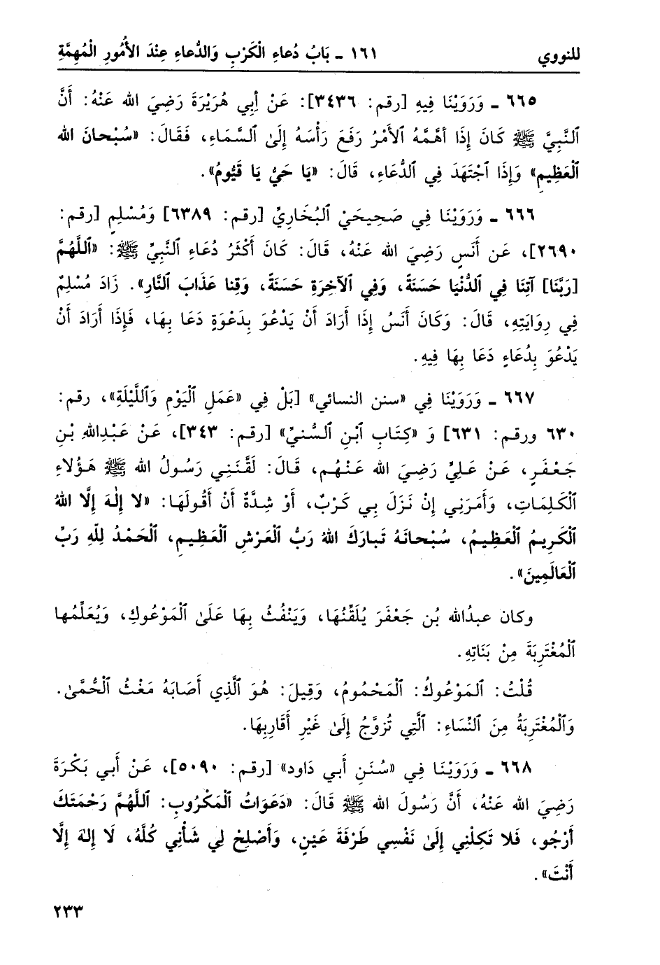 667- وروينا في "سنن النسائي" [بل في "عمل اليوم والليلة"، رقم: 630 ورقم: 631] و"كتاب ابن السني" [رقم: 343] ، عن عبد الله بن جعفر، عن عليّ رضي الله عنهم، قال: لَقَّنني رسول الله صلى الله عليه وسلم هؤلاء الكلمات، وأمرني إن نزل بي كرب، أو شدّة أن أقولها: "لا إِلهَ إِلاَّ اللَّهُ الكَرِيمُ العَظِيمُ، سبحانهُ تَبارَكَ اللَّه رَبّ العَرْشِ العَظِيمِ، الحمدُ لِلَّهِ رَبّ العالَمِينَ".