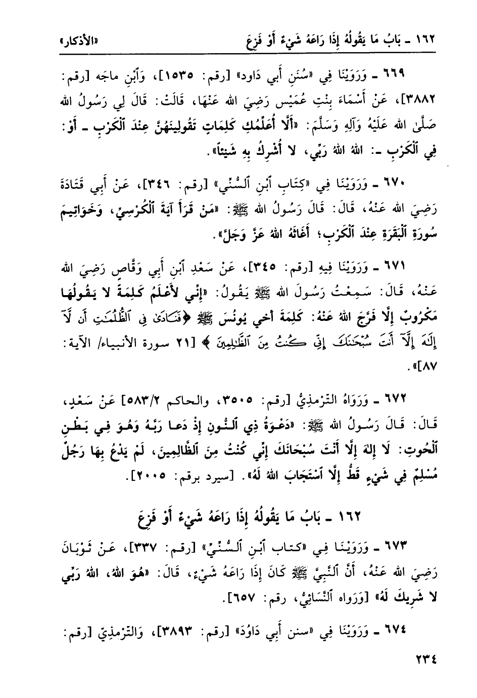 673- وروينا في "كتاب ابن السني" [رقم: 337] ، عن ثوبانَ رضي الله عنه، أن النبي صلى الله عليه وسلم كان إذا راعَه شيءٌ، قال: "هُوَ اللَّهُ، الله ربي لا شريك له" [ورواه النسائي، رقم: 657] .