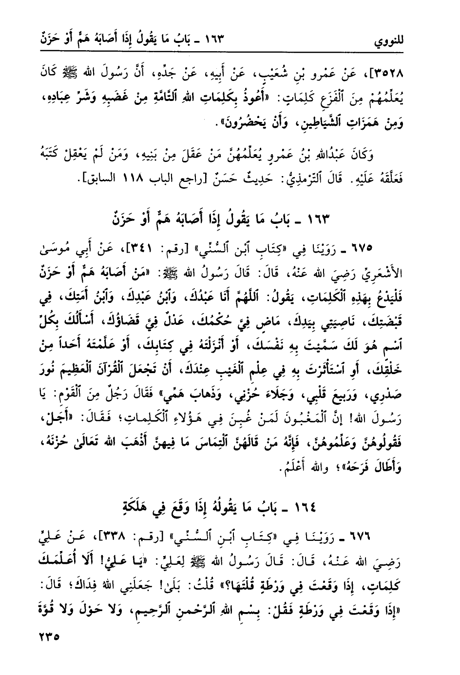 675- روينا في "كتاب ابن السني" [رقم: 341] ، عن أبي موسى الأشعري رضي الله عنهُ، قال: قال رسول الله صلى الله عليه وسلم: "مَنْ أصَابَهُ هَمٌّ أوْ حَزَنٌ فَلْيَدْعُ بِهَذِهِ الكَلِماتِ، يَقُولُ: اللَّهُمَّ أَنَا عَبْدُكَ، وَابْنُ عَبدِكَ، وابْنُ أَمَتِكَ، فِي قَبْضَتِكَ، ناصِيَتِي بِيَدِكَ، ماضٍ فِيَّ حُكْمُكَ، عدلٌ فِيَّ قَضَاؤُكَ، أسألُكَ بِكُلّ اسْمٍ هُوَ لَكَ سَمَّيْتَ بِهِ نَفْسَكَ، أوْ أنْزَلْتَهُ فِي كِتابِكَ، أوْ عَلَّمْتَه أحَداً مِنْ خَلْقِكَ، أوِ اسْتَأثَرْتَ بِهِ فِي عِلْمِ الغَيْبِ عِنْدَكَ، أنْ تجعل القرآن العظيم نُورَ صَدْرِي، وَرَبِيعَ قَلْبِي، وَجلاءَ حُزْنِي، وَذَهَابَ هَمّي" فقال رجلٌ من القوم: يا رسول الله! إن المغبونَ لمن غبن في هؤلاء الكلمات؛ فقال: "أجَلْ، فَقُولُوهُنَّ وَعَلِّمُوهُنَّ، فإنَّهُ مَنْ قَالَهُنَّ الْتِماسَ ما فِيهِنَّ أذْهَبَ اللَّهُ تَعالى حُزنهُ، وأطالَ فرحهُ"؛ والله أعلمُ.
