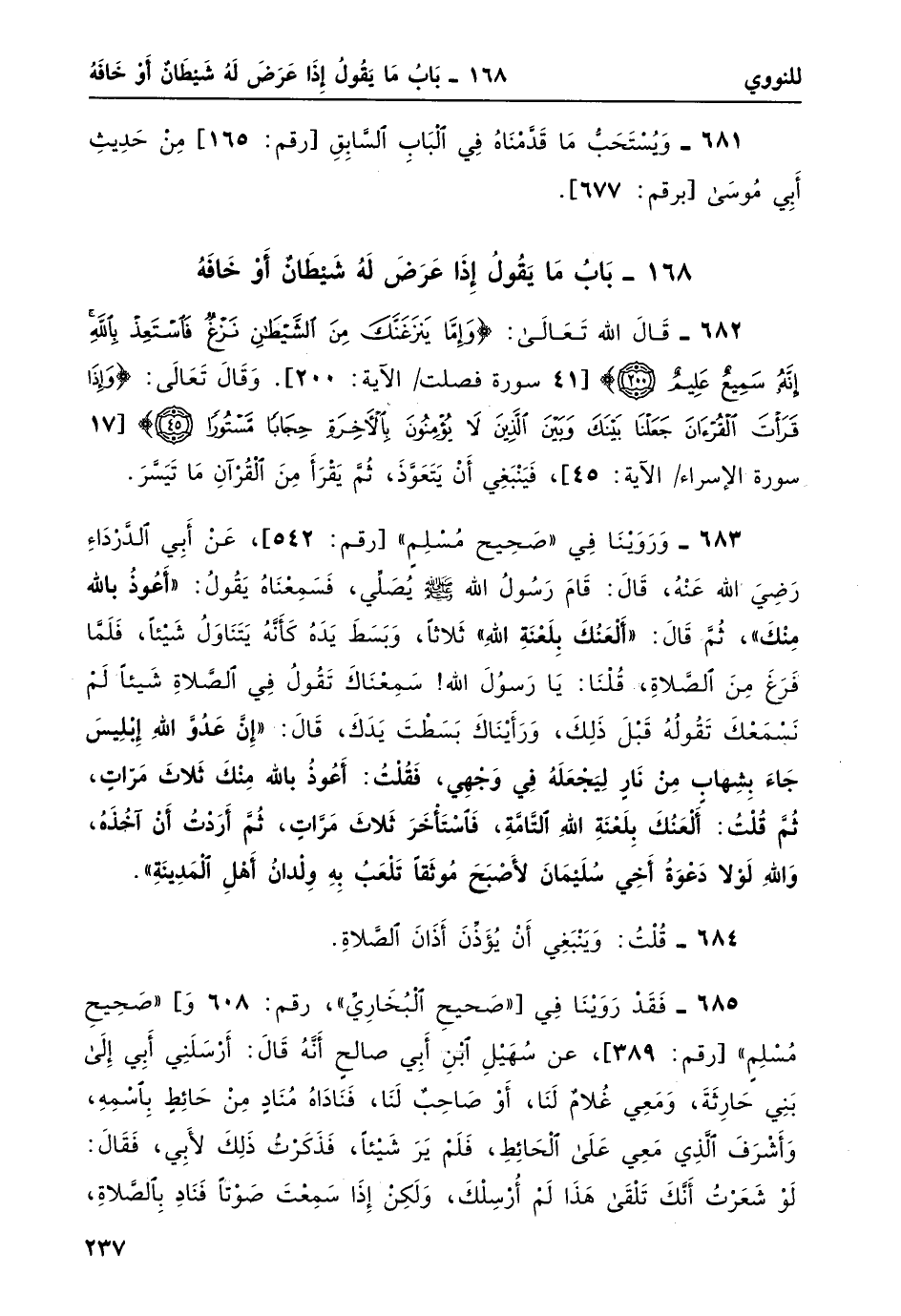 683- وروينا في صحيح مسلم [رقم: 542] ، عن أبي الدرداء رضي الله عنهُ، قال: قام رسولُ الله صلى الله عليه وسلم يُصلِّي، فسمعناهُ يقولُ: "أعوذُ بِاللَّهِ مِنْكَ"، ثم قال: "ألْعَنُك بِلَعْنَةِ اللَّهِ" ثَلاثاً، وبسطَ يدهُ كأنَّه يتناول شيئاً، فلما فرغَ من الصلاة، قلنا: يا رسول الله! سمعناك تقول في الصلاةِ شيئاً لم نسمعْكَ تقولهُ قبلَ ذلك، ورأيناكَ بسطتَ يدَكَ، قال: "إنَّ عَدُوَّ اللَّهِ إِبْلِيسَ جاءَ بِشِهابٍ مِنْ نارٍ ليجعلهُ في وَجْهِي، فقلتُ: أعوذُ باللَّهِ مِنْكَ ثَلاثَ مَرَّاتٍ، ثُمَّ قلتُ: أعلنك بلعنة الله التامة، فاسْتأخَرَ ثَلاثَ مَرَّاتٍ، ثُمَّ أرَدْتُ أنْ آخذهُ، وَاللَّهِ لَوْلا دعوةُ أخي سُلَيْمانَ لأصْبَحَ مُوثَقاً تَلْعَبُ بِهِ ولدانُ أهلِ المَدِينَةِ".