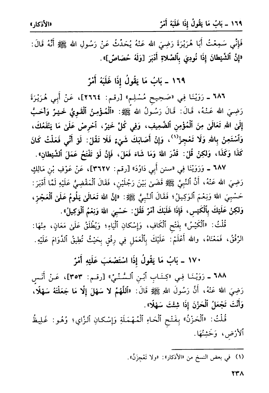 687- وروينا في "سنن أبي داود" [رقم: 3627] ، عن عوف بن مالك رضي الله عنهُ، أن النبي صلى الله عليه وسلم قضى بين رجلين، فقال المقضيّ عليه لمّا أدبر: حَسْبِيَ اللَّهُ ونِعمَ الوَكِيلُ؛ فقال النبي صلى الله عليه وسلم: "إِنَّ اللَّهَ تَعالى يلومُ على العَجْزِ، وَلَكِنْ عَلَيْكَ بالكَيْسِ، فإذَا غَلَبَكَ أمْرٌ فَقُلْ: حَسْبِيَ اللَّهُ ونِعمَ الوَكِيلُ".