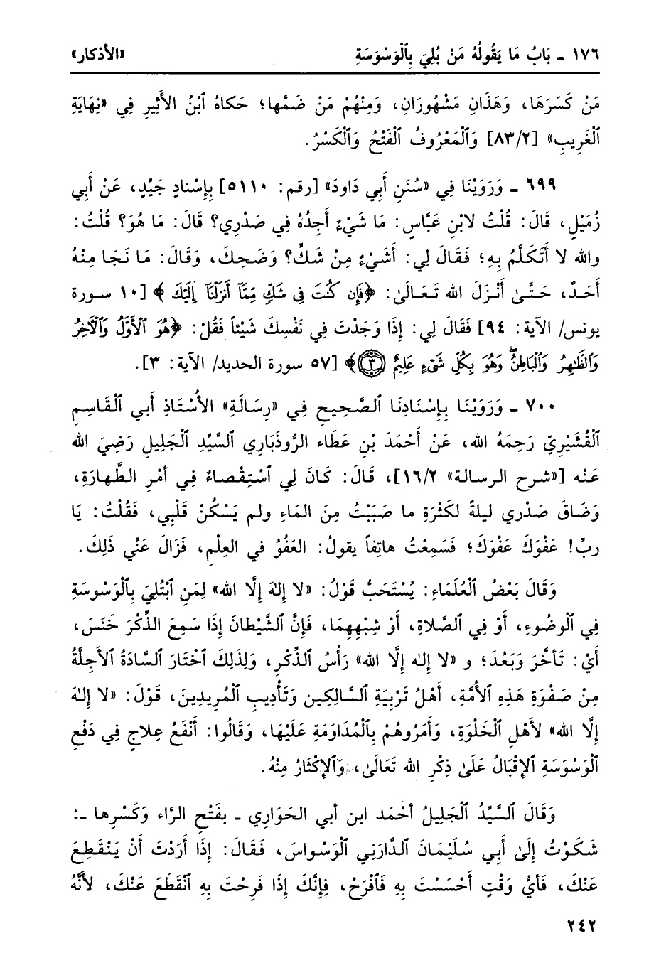 700- وروينا بإسنادنا الصحيح في "رسالة" الأستاذ أبي القاسم القُشيري رحمه الله، عن أحمد بن عطاء الروذباري السيد الجليل رضي الله عنه ["شرح الرسالة" 16/2] ، قال: كان لي استقصاءٌ في أمر الطهارة، وضاق صدري ليلة لكثرة ما صببتُ من الماء ولم يسكنْ قلبي، فقلت: يا ربّ! عفوك عفوك؛ فسمعتُ هاتفاً يقولُ: العفو في العلم، فزال عني ذلك.