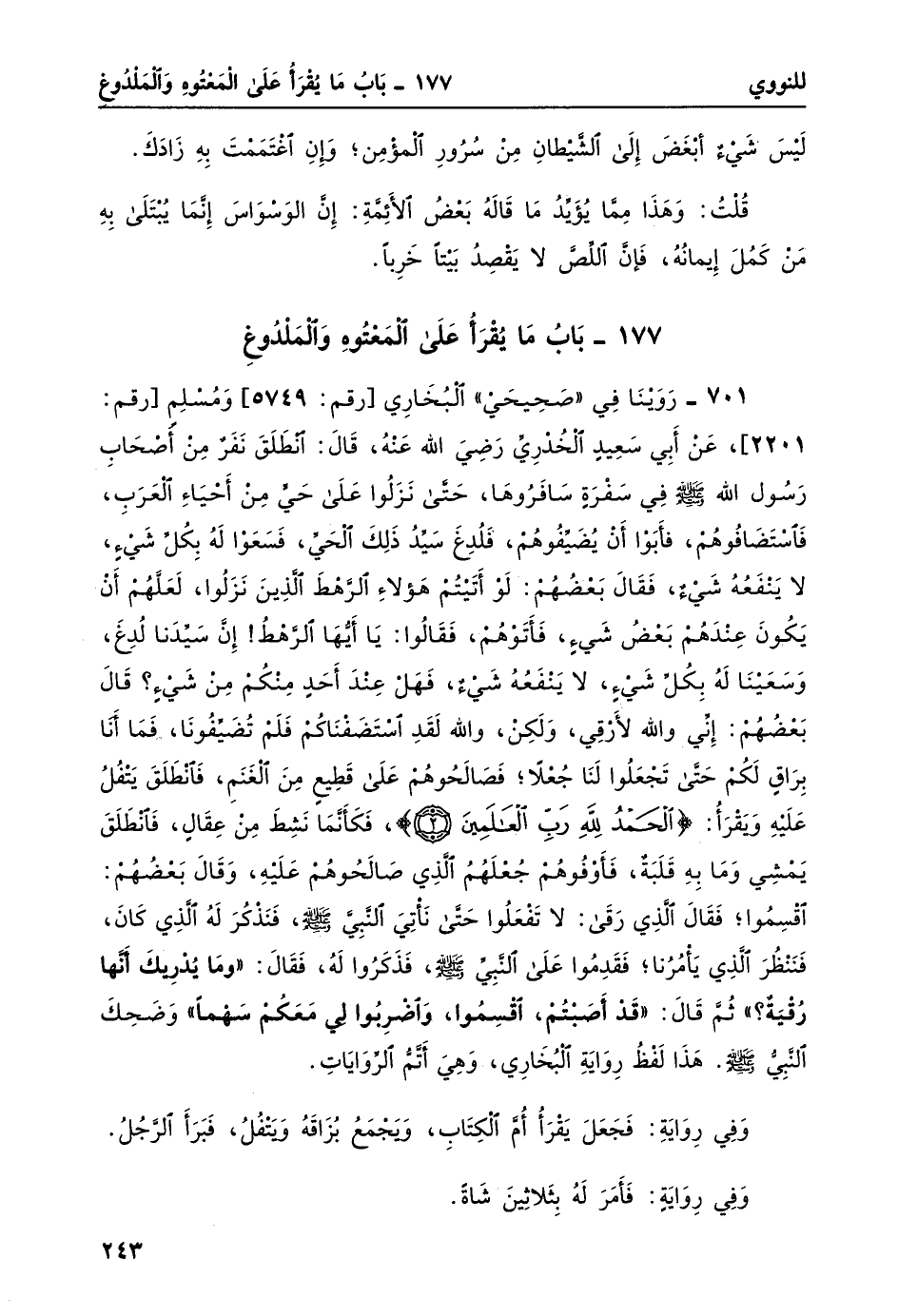 701- روينا في "صحيحي" البخاري [رقم: 5749] ومسلم [رقم: 2201] ، عن أبي سعيد الخدري رضي الله عنهُ، قال: انطلق نفرٌ من أصحاب رسول الله صلى الله عليه وسلم في سفرةٍ سافروها، حتى نزلوا على حيٍّ من أحياء العرب، فاستضافُوهم، فأبوا أن يُضيِّفوهم، فلُدغ سيِّدُ ذلك الحيّ، فسعَوْا له بكل شيء، لا ينفعُه شيءٌ، فقال بعضُهم: لو أتيتم هؤلاء الرَّهَطَ الذين نزلوا، لعلَّهم أن يكونَ عندهم بعضُ شيءٍ، فأتوهُم، فقالوا: يا أيُّها الرَّهط! إنَّ سيدنا لُدغ، وسعينا له بكل شيء، لا ينفعه شيءٌ، فهل عندَ أحدٍ منكم من شيءٍ؟ قال بعضُهم: إني والله لأَرْقي، ولكنْ، والله لقد استضفناكم فلم تضيِّفونا، فما أنا براقٍ لكم حتى تجعلوا لنا جُعلاً، فصالحُوهم على قطيع من الغنم، فانطلقَ يتفلُ عليه ويقرأُ: {الْحَمْدُ لِلَّهِ رَبِّ الْعَالَمِينَ} ، فكأنما نَشِطَ من عقال، ناطلق يمشي وما به قَلَبَة، فأوفوهم جُعْلَهم الذي صالحوهم عليه، وقال بعضُهم: اقسموا؛ فقال الذي رَقَى: لا تفعلوا حتى نأتيَ النبيّ صلى الله عليه وسلم، فنذكرَ له الذي كان، فننظر الذي يأمرنا؛ فقدموا على النبي صلى الله عليه وسلم، فذكروا له، فقال: "وَما يُدْرِيكَ أنها رُقْيَةٌ"؟ ثم قال: "قَدْ أصَبْتُمُ، اقْسِمُوا، وَاضْرِبُوا لي مَعَكُم سَهماً" وضحك النبيّ صلى الله عليه وسلم. هذا لفظ رواية البخاري، وهي أتمّ الروايات.