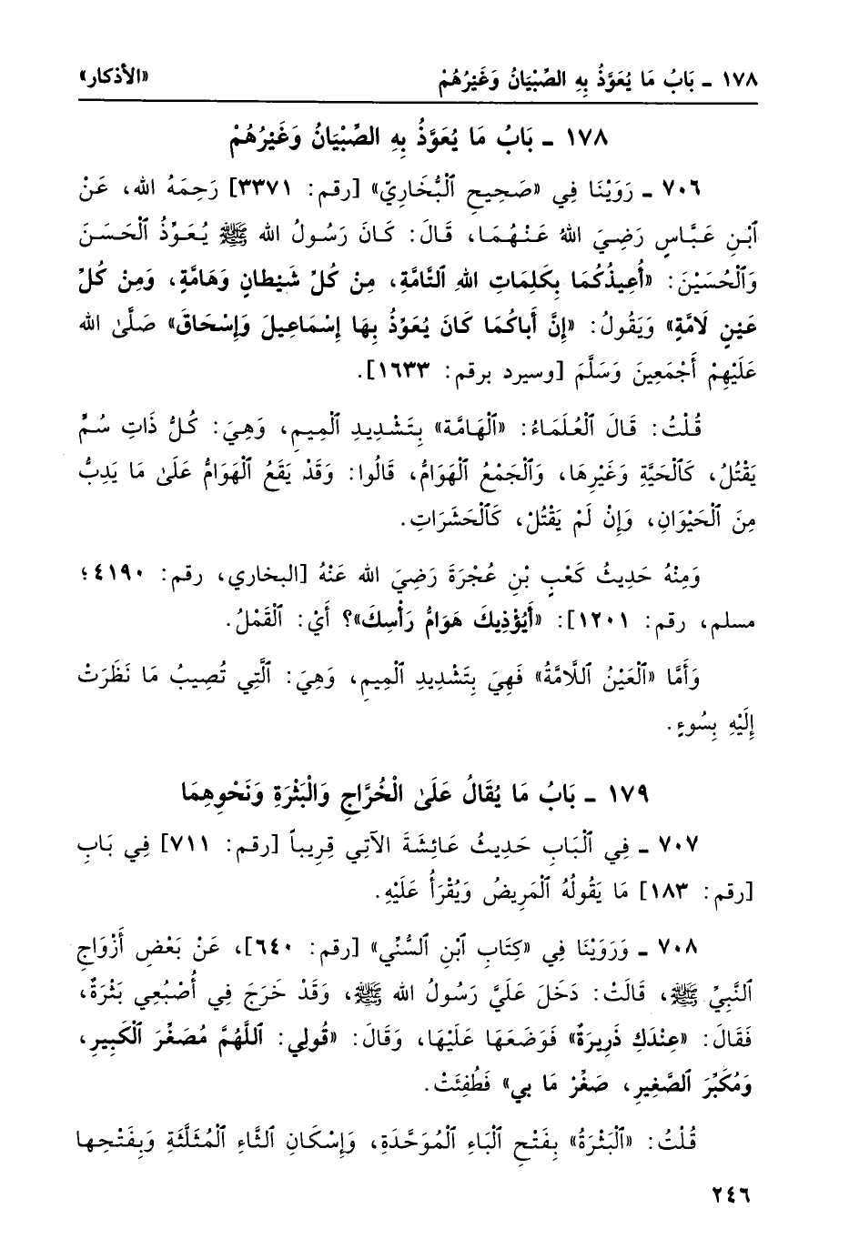 706- روينا في صحيح البخاري [رقم: 3371] رحمه الله، عن ابن عباس رضي الله عنهما، قال: كان رسول الله صلى الله عليه وسلم يُعوِّذ الحسن والحسين: "أعيذُكُما بكلماتِ اللَّهِ التَّامَّةِ، مِنْ كُلِّ شيطانٍ وهامةٍ، وَمِنْ كُلّ عَيْنٍ لامَّةٍ" ويقولُ: "إنَّ أباكُما كان يُعَوِّذُ بِها إسْماعِيلَ وَإسْحاقَ" صلى الله عليهم أجمعين وسلم [وسيرد برقم: 1633] .