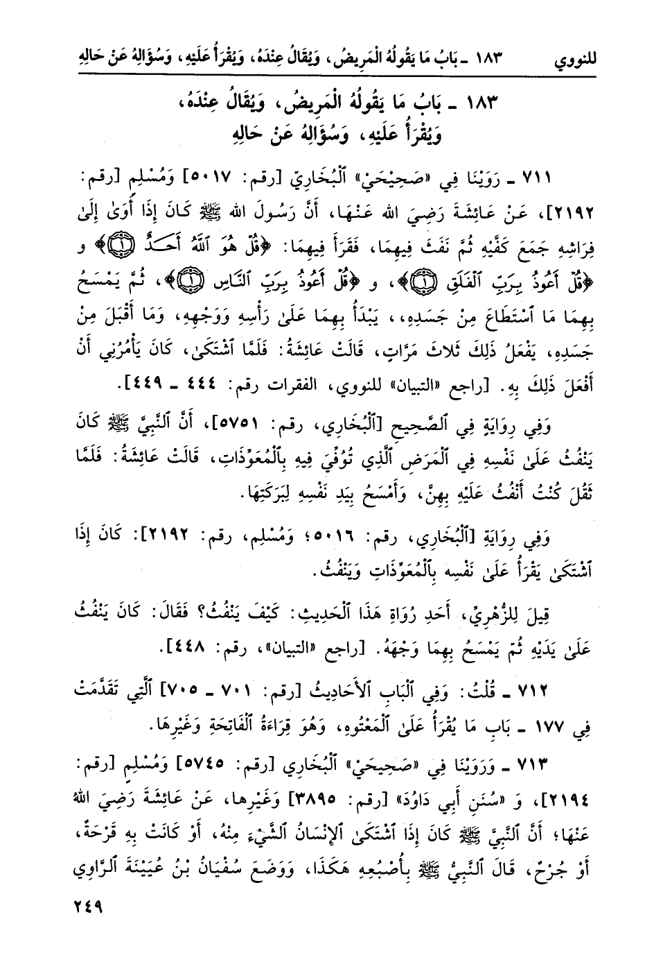 711- روينا في صحيحي البخاري [رقم: 5017] ومسلم [رقم: 2192] ، عن عائشة رضي الله عنها، أن رسول الله صلى الله عليه وسلم كان إذا أوى إلى فراشه جمع كفّيه ثم نفث فيهما، فقرأ فيهما: {قُلْ هُوَ اللَّهُ أَحَدٌ} ، و {قُلْ أَعُوذُ بِرَبِّ الْفَلَقِ} ، و {قُلْ أَعُوذُ بِرَبِّ النَّاسِ} ، ثم يمسحُ بهما ما استطاع من جسده، يبدأ بهما على رأسه ووجهه، وما أقبل من جسده، يفعلُ ذلك ثلاثَ مرّاتٍ، قالت عائشة: فلما اشتكى، كان يأمرني أن أفعل ذلك به. [راجع التبيان للنووي، الفقرات رقم: 444-449] .