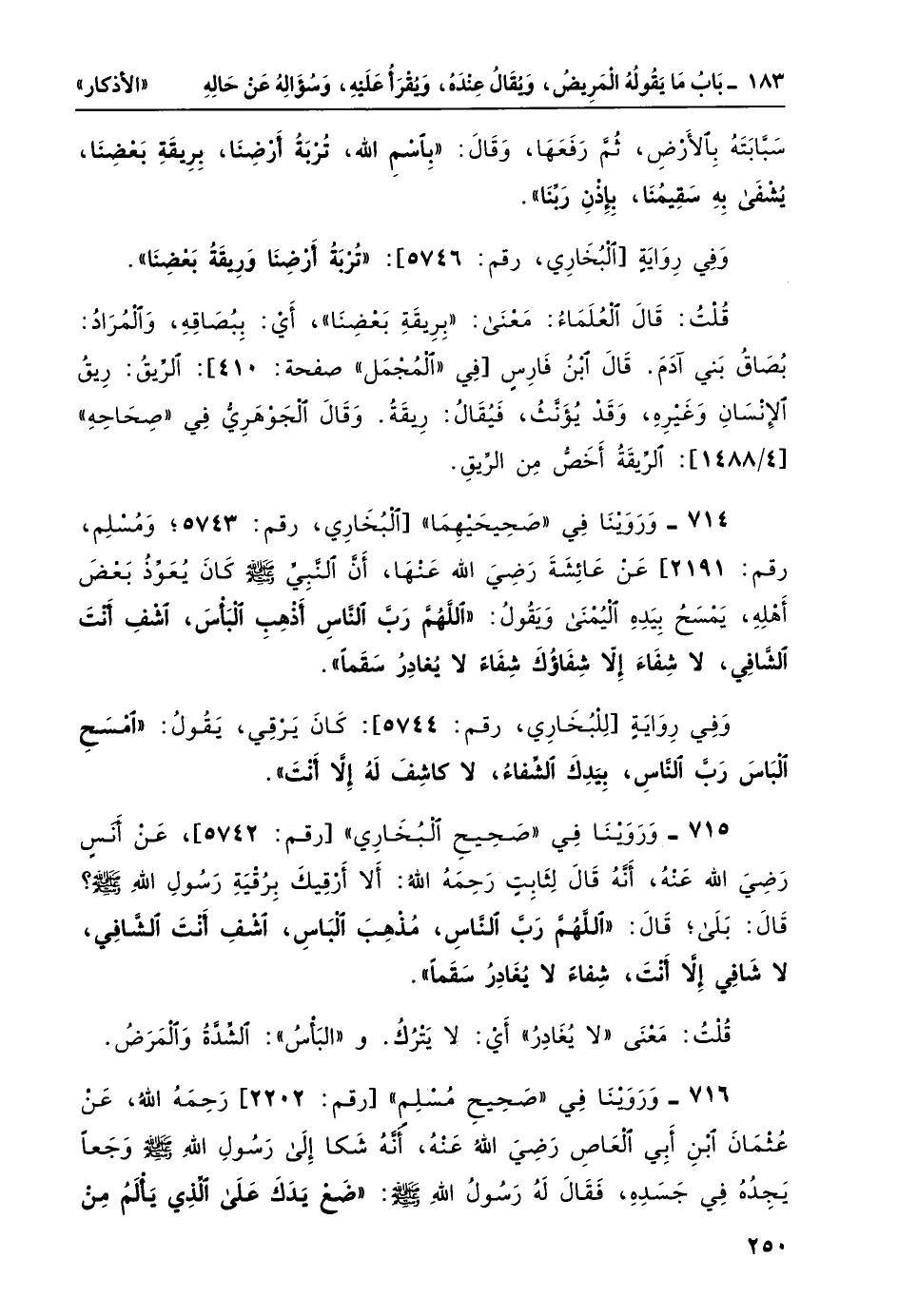 714- وروينا في صحيحهما [البخاري، رقم: 5743؛ ومسلم، رقم: 2191] عن عائشة رضي الله عنها، أن النبي صلى الله عليه وسلم كان يُعَوِّذُ بعضَ أهله، يمسَحُ بيده اليمنى ويقول: "اللَّهُمَّ رَبَّ النَّاسِ أذْهِبِ البأسَ، اشْفِ أنْتَ الشَّافِي، لا شِفاءَ إِلاَّ شِفاؤُكَ شِفاءً لا يُغادِرُ سَقَماً".