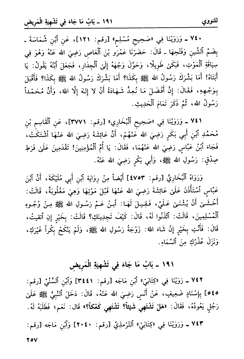 740- وروينا في صحيح مسلم [رقم: 121] ، عن ابن شُماسة -بضم الشين وفتحها- قال: حضرنا عمرو بن العاص رضي الله عنهُ وهو في سِياقة الموت، فبكى طويلاً، وحوّل وجههُ إلى الجدارِ، فجعل ابنهُ يقولُ: يا أبتاه! أما بَشَّرَكَ رسولُ الله صلى الله عليه وسلم بكذا؟ أما بشِّرك رسولُ الله صلى الله عليه وسلم بكذا؟ فأقبلَ بوجهه، فقال: إنَّ أفضلَ ما نُعِدُّ شهادةُ أن لا إله إلا الله، وأن محمداً رسولُ الله، ثم ذكرَ تمامَ الحديث.