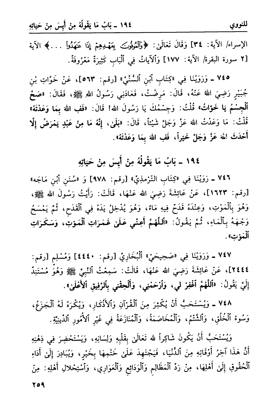 748- ويستحبّ أن يكثرَ من القرآن والأذكار، ويكرهُ له الجزعُ، وسوءُ الخلُق، والشتمُ، والمخاصمةُ، والمنازعةُ في غير الأمور الدينية.