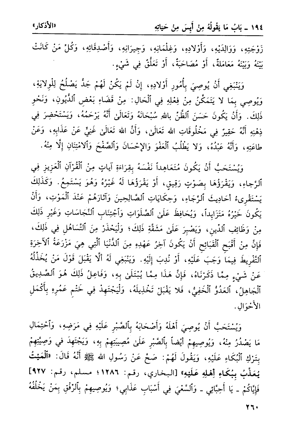 ويستحبّ أن يكون مُتعاهداً نفسه بقراءة آياتٍ من القرآن العزيز في الرجاء، ويقرؤُها بصوتٍ رقيق، أو يقرؤُها له غيره وهو يستمع. وكذلك يستقرئ أحاديث الرجاء، وحكاياتِ الصالحين وآثارَهم عند الموت، وأن يكونَ خيرهُ مُتزايداً، ويُحافظ على الصلوات واجتناب النجاسات وغير ذلك من وظائف الدين، ويصبر على مشقة ذلك؛ وليحذرْ من التساهلُ في ذلك، فإن من أقبح القبائح أن يكونَ آخِرُ عهده من الدنيا التي هي مزرعة الآخرة التفريط فيما وجب عليه، أو ندب إليه. وينبغي له ألا يقبل قول من يخذله عن شيء مما ذكرناهُ، فإن هذا مما يُبتلى به، وفاعلُ ذلك هو الصديق الجاهل، العدوّ الخفيّ، فلا يقبل تخذيله، وليجتهد في ختم عمره بأكمل الأحوال.