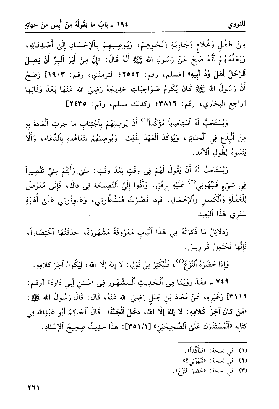 749- فقد روينا في الحديث المشهور في "سنن أبي داود" [رقم: 3116] وغيره، عن معاذ بن جبل رضي الله عنهُ، قال: قال رسول الله صلى الله عليه وسلم: "مَنْ كَان آخِرَ كَلامِه: لا إِلهَ إِلاَّ اللَّهُ، دَخَلَ الجَنَّةَ". قال الحاكم أبو عبد الله في كتابه "المستدرك على الصحيحين" [1/ 351] : هذا حديثٌ صحيحُ الإسناد.