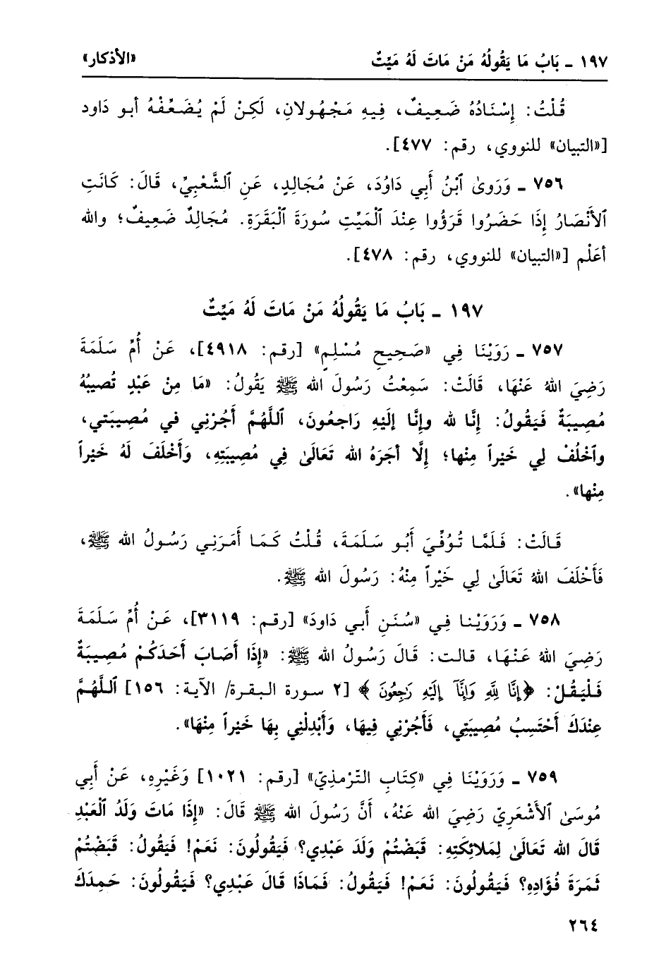 758- وروينا في "سنن أبي داود" [رقم: 3119] ، عن أُمّ سلمة رضي الله عنها، قالت: قال رسول الله صلى الله عليه وسلم: "إِذَا أصَابَ أحَدَكُمْ مُصِيبَةٌ فليقل: {إِنَّا لِلَّهِ وَإِنَّا إِلَيْهِ رَاجِعُونَ} [البقرة: 156] اللَّهُمَّ عِنْدَكَ أحْتَسِبُ مُصِيبَتِي، فأْجُرْنِي فِيها، وأبْدِلْنِي بِها خَيْراً مِنها".