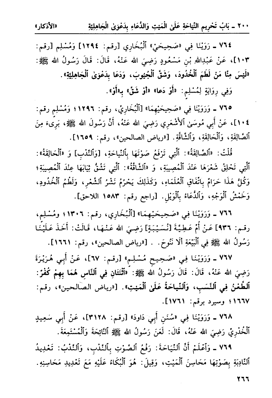 763- أجمعت الأمّةُ على تحريم النياحة، والدعاء بدعوى الجاهلية، والدعاء بالويل والثبور عند المصيبة.