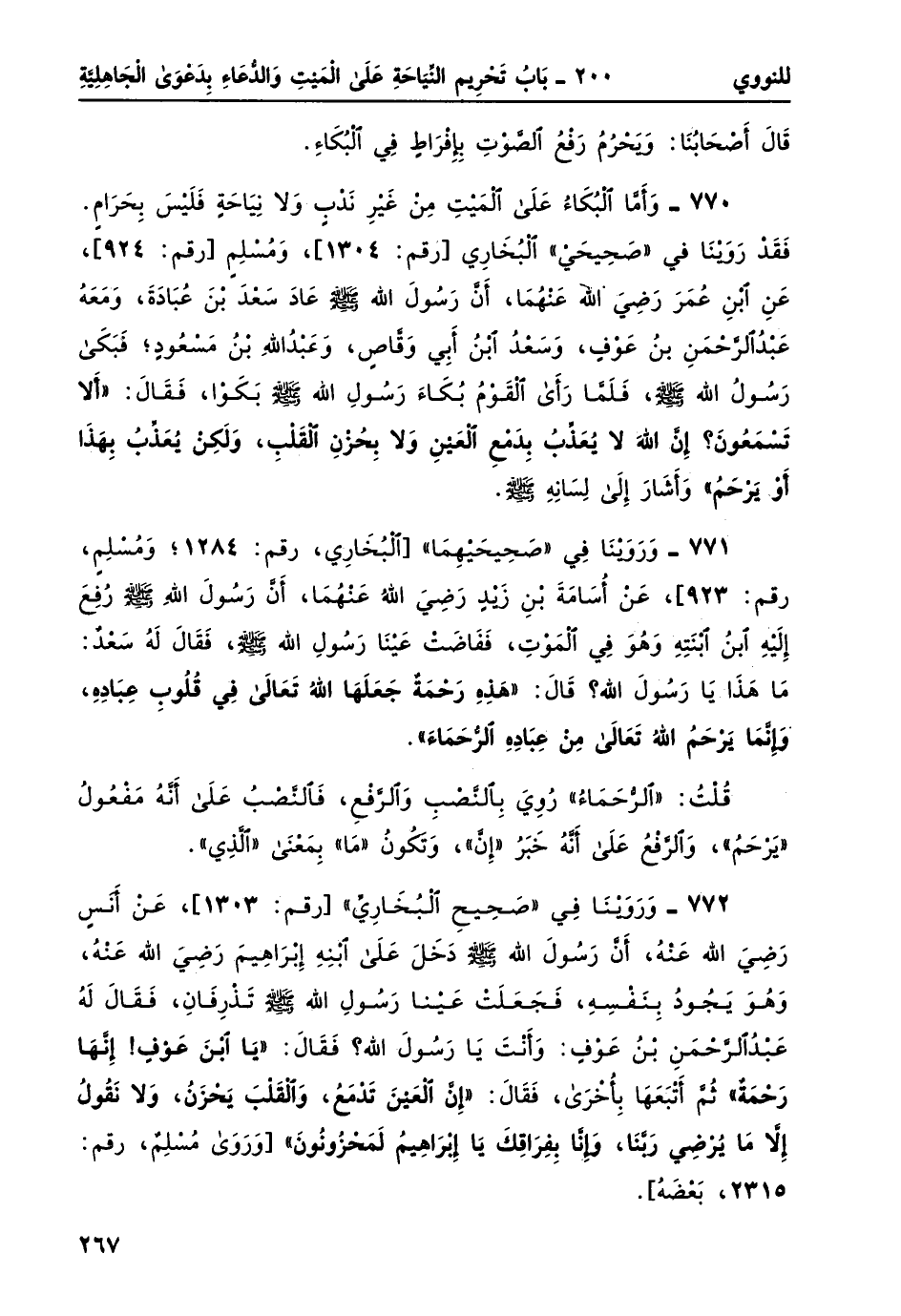 770- وأما البكاء على الميت من غير ندب ولا نياحةٍ فليس بحرام. فقد روينا في "صحيحي" البخاري [رقم: 1304] ، ومسلم [رقم: 924] ، عن ابن عمر رضي الله عنهما، أن رسول الله صلى الله عليه وسلم عاد سعد بن عبادة، ومعه عبد الرحمن بن عوف، وسعد بن أبي وقاص، وعبد الله بن مسعودٍ، فبكى رسولُ الله صلى الله عليه وسلم، فلما رأى القومُ بكاءَ رسول الله صلى الله عليه وسلم بكَوْا، فقال: "ألا تَسْمَعُونَ؟ إنَّ اللَّهَ لا يُعذب بِدَمْعِ العَيْنِ ولا بِحُزْنِ القَلْبِ، وَلَكِنْ يُعَذّبُ بِهَذَا أَوْ يَرْحَمُ" وأشار إلى لسانه صلى الله عليه وسلم.