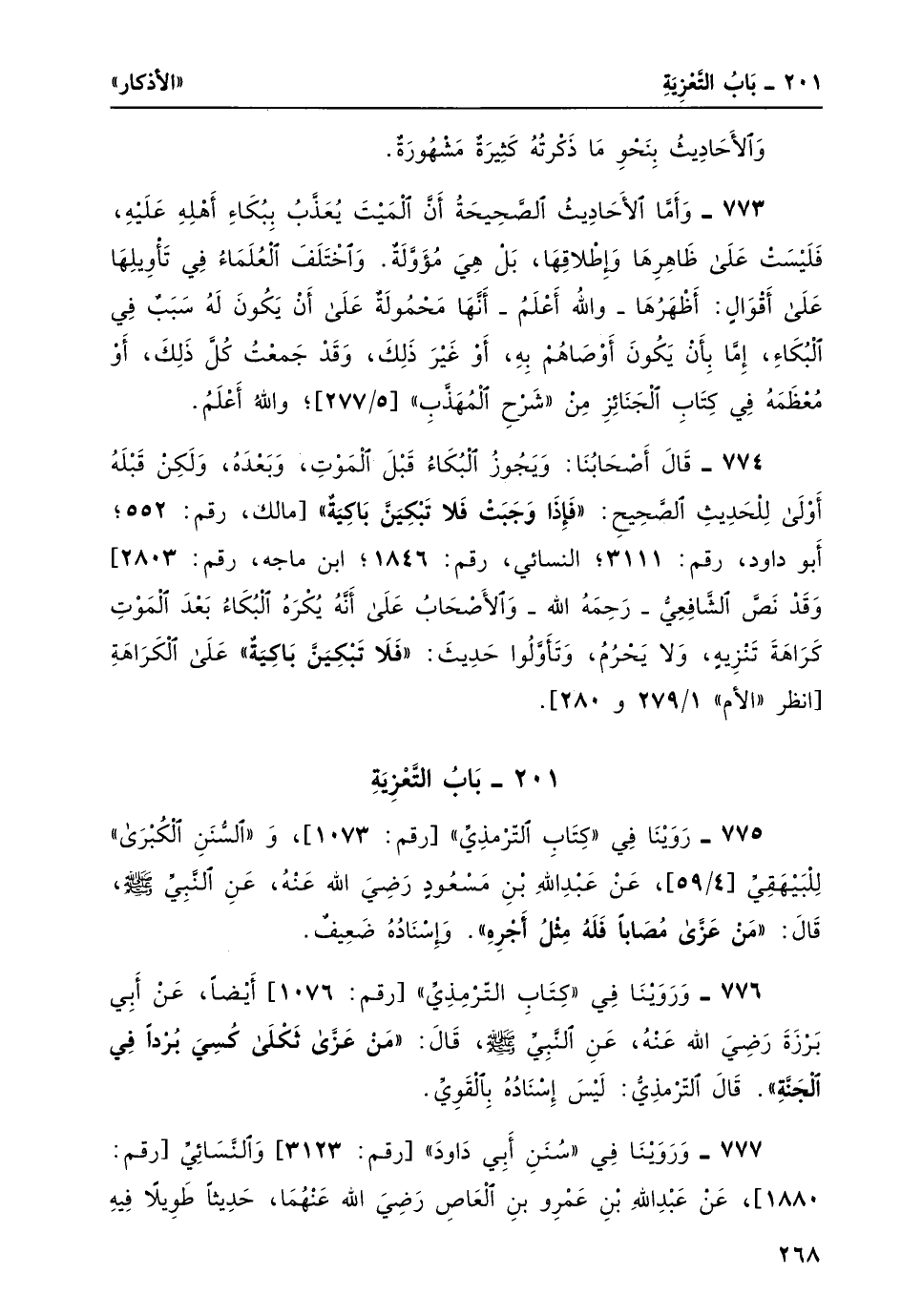 773- وأما الأحاديث الصحيحة أن الميت يعذب ببكاء أهله عليه، فليست على ظاهرها وإطلاقها، بل هي مُئَوَّلَةٌ. واختلف العلماء في تأويلها على أقوال: أظهرها -والله أعلم- أنها محمولة على أن يكون له سبب في البكاء، إما بأن يكون أوصاهم به، أو غير ذلك، وقد جمعت كل ذلك، أو معظمه في كتاب الجنائز من "شرح المهذب" [6/ 277] ؛ والله أعلمُ.