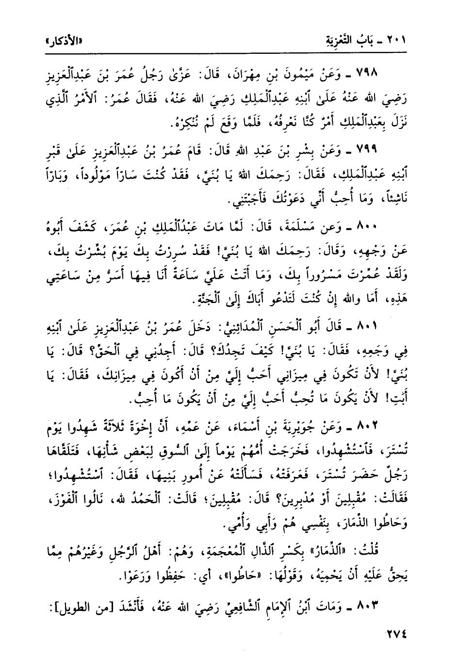 798- وعن ميمون بن مهران، قال: عزَّى رجل عمرَ بن عبد العزيز رضي الله عنهُ على ابنه عبد الملك رضي الله عنه، فقال عمر: الأمر الذي نزل بعبد الملك أمرٌ كنّا نعرفهُ، فلما وقع لم ننكره.