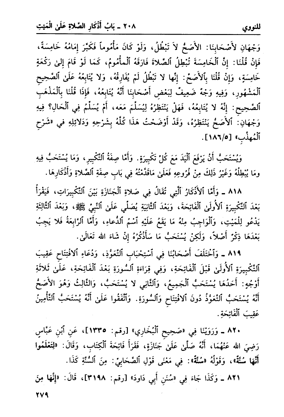 818- وأما الأذكارُ التي تقالُ في صلاةِ الجنازة بين التكبيرات، فيقرأ بعد التكبيرة الأولى الفاتحة، وبعد الثانية يُصلِّي على النبي صلى الله عليه وسلم، وبعد الثالثة يدعو للميت، والواجب منه ما يقع عليه اسم الدعاء، وأما الرابعة فلا يجب بعدها ذكرٌ أصلاً، ولكن يُستحبّ ما سأذكره إن شاء الله تعالى.