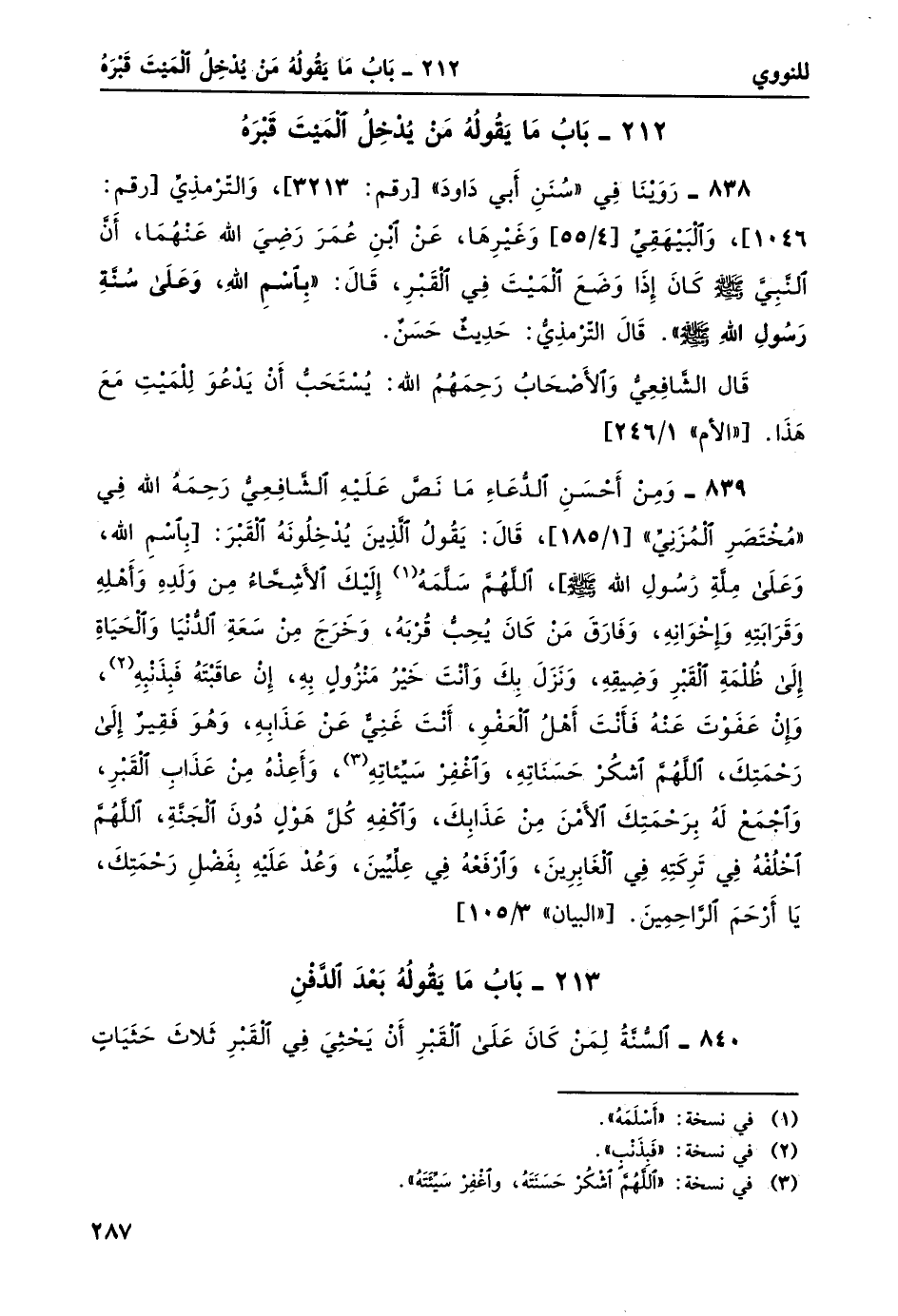 838- روينا في سنن أبي داود [رقم: 3213] ، والترمذي [رقم: 1046] ، والبيهقي [4/ 55] وغيرها، عن ابن عمر رضي الله عنهما، أن النبي صلى الله عليه وسلم كان إذا وضع الميت في القبر، قال: "بِاسْمِ اللَّهِ، وَعَلى سُنَّة رَسُولِ الله صلى الله عليه وسلم". قال الترمذي: حديثٌ حسنٌ.