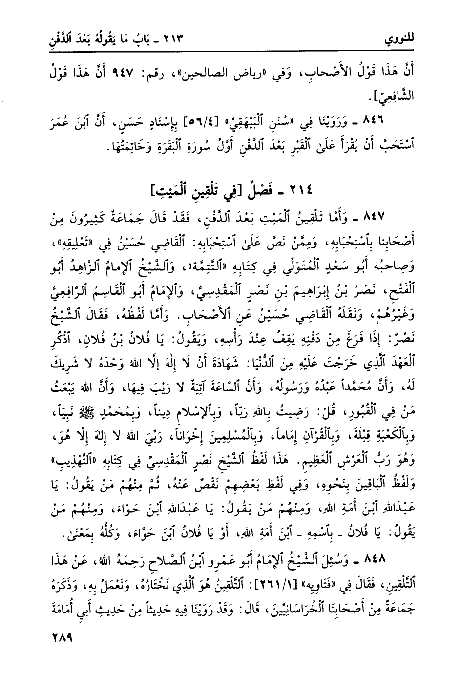 847- وأما تلقينُ الميّت بعد الدفن، فقد قال جماعة كثيرون من أصحابنا استحبابه، وممّن نصَّ على استحبابه: القاضي حسين في "تعليقه"، وصاحبه أبو سعد المتولي في كتابه التتمة، والشيخ الإِمام الزاهد أبو الفتح، نصر بن إبراهيم بن نصر المقدسي، والإِمام أبو القاسم الرافعي وغيرهم، ونقله القضاي حسين عن الأصحاب. وأما لفظه، فقال الشيخ نصر: إذا فرغ من دفنه يقف عند رأسه، ويقولُ: يا فلانُ بن فلانٍ، اذكر العهد الذي خرجتَ عليه من الدنيا: شهادة أن لا إله إلا الله وحده لا شريك له، وأن محمدا عبده ورسوله، وأن الساعة آتيةٌ لا ريب فيها، وأن الله يبعث مَن في القبور، قُل: رضيتُ بالله ربّاً، وبالإسلام دينا، وبمحمد صلى الله عليه وسلم نبيّاً، وبالكعبة قبلة، وبالقرآن إماماً، وبالمسلمين إخواناً، ربّي الله لا إِلهَ إِلا هو، وهو رَبّ العَرْشِ العَظِيمِ. هذا لفظ الشيخ نصر المقدسي في كتابه "التهذيب" ولفظ الباقين بنحوه، وفي لفظ بعضهم نقص عنه، ثم منهم مَن يقول: يا عبد الله ابن أمة الله، ومنهم مَن يقول: يا عبد الله ابن حوّاء، ومنهم من يقول: يا فلان -باسمه- ابن أمة الله، أو يا فلانُ ابن حوّاء، وكله بمعنى.