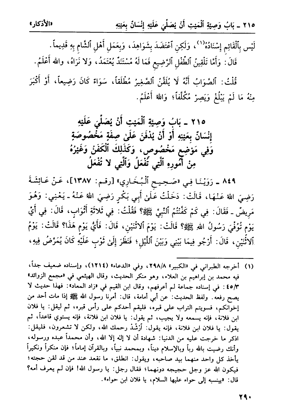 بابُ وصيّةِ الميّتِ أنّ يُصلي عليه إنسانٌ بعينه أو أن يُدفن على صفةٍ مخصوصةٍ وفي مَوْضعٍ مَخصوص، وكذلك الكفنُ وغيرُه من أمورِه التي تُفعل والتي لا تُفعل:
