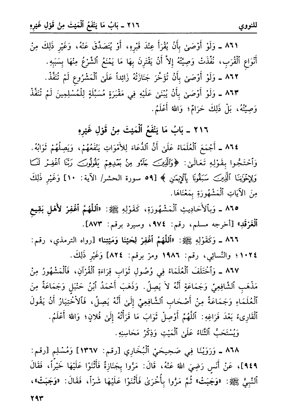 864- أجمع العلماء على أن الدعاء للأموات ينفعهم، ويَصلُهم ثوابه. واحتجوا بقوله تعالى: {وَالَّذِينَ جَاءُوا مِنْ بَعْدِهِمْ يَقُولُونَ رَبَّنَا اغْفِرْ لَنَا وَلِإِخْوَانِنَا الَّذِينَ سَبَقُونَا بِالْإِيمَانِ} [الحشر: 10] وغير ذلك من الآيات المشهورة بمعناها.