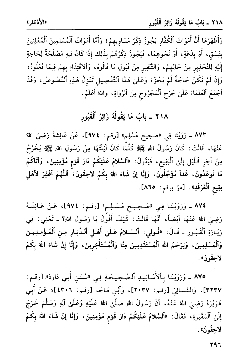 874- وروينا في "صحيح مسلم" [رقم: 974] ، عن عائشة رضي الله عنها أيضاً، أنها قالت: كيف أقولُ يا رسولَ الله؟ -تعني: في زيارة القبور- قال: "قُولي: السَّلامُ على أهْلِ الدّيارِ مِنَ المُؤْمنينَ وَالمُسْلمينَ، وَيَرْحَمُ اللَّهُ المستقدمين منّا والمستأخرين، إنا إن شاء الله بكم لاحقون".
