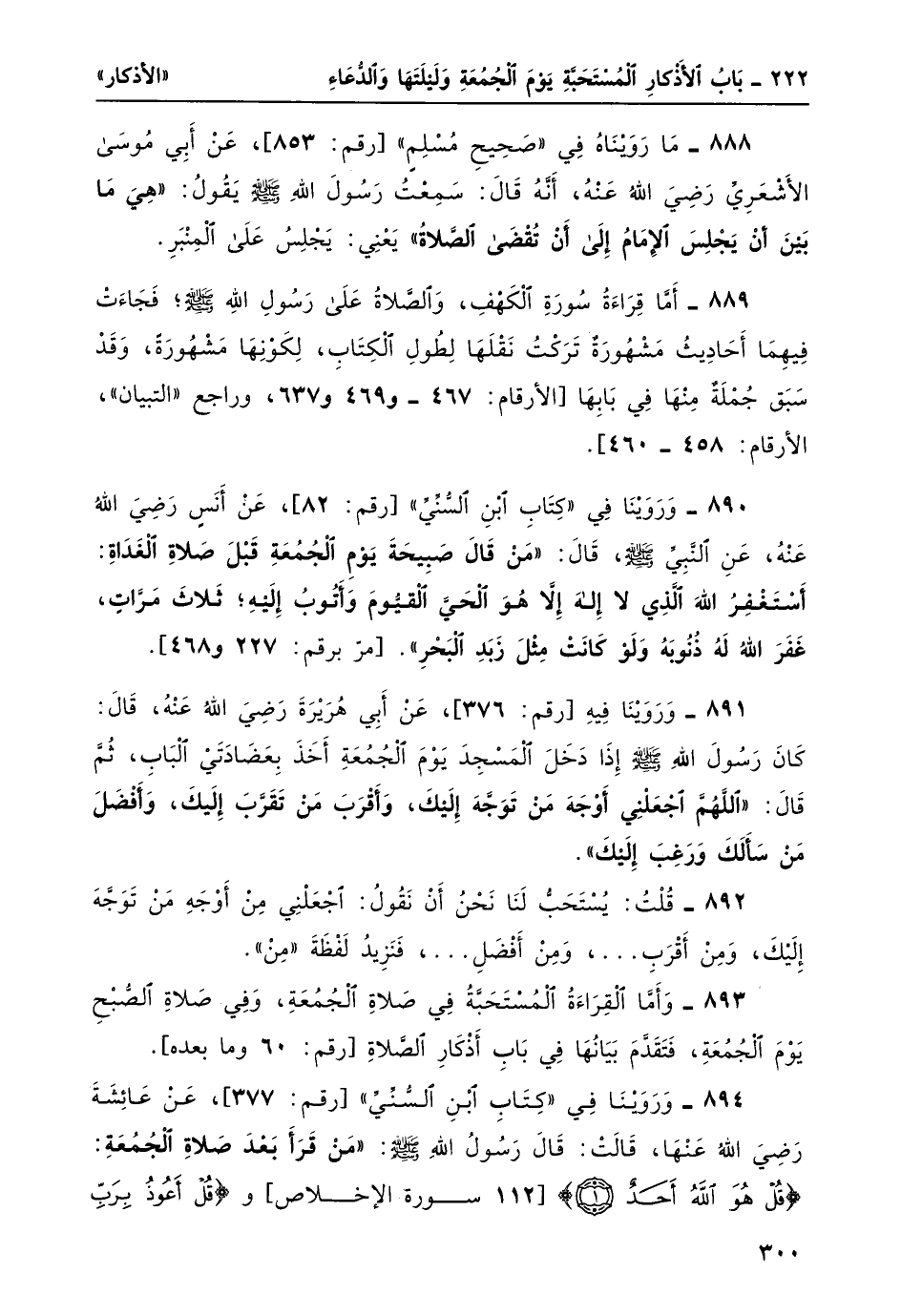 889- أما قراءةُ سورة الكهف، والصلاةُ على رسول الله صلى الله عليه وسلم؛ فجاءتْ فيهما أحاديث مشهورةٌ تركتُ نقلَها لطول الكتاب، لكونها مشهورة، وقد سبق جملةٌ منها في بابها [الأرقام: 467 و469 و637، وراجع "التبيان"، الأرقام: 458-460] .
