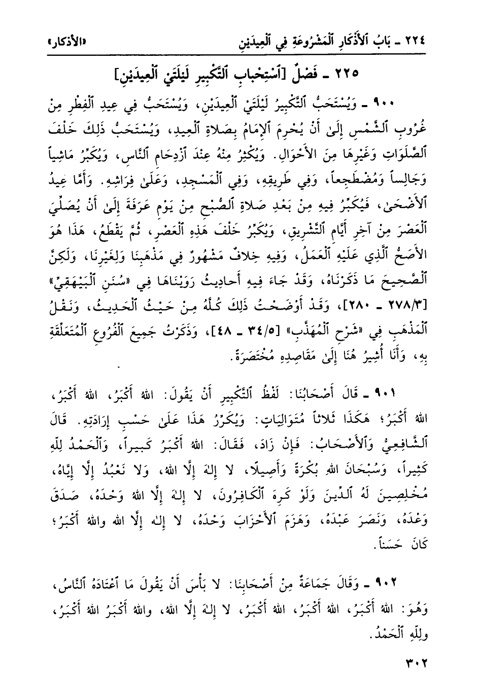 900- ويستحبّ التكبير ليلتي العيدين، ويُستحبّ في عيد الفطر من غروب الشمس إلى أن يُحرم الإِمام بصلاة العيد، ويُستحبّ ذلك خلفَ الصلواتِ وغيرها من الأحوال. ويُكثر منه عند ازدحام الناس، ويُكَبِّر ماشياً وجالساً ومضطجعاً، وفي طريقه، وفي المسجد، وعلى فراشه. وأما عيدُ الأضحى، فيُكَبِّر فيه من بعد صلاة الصبح مِنْ يَوْمِ عَرَفة إلى أن يصليَ العصر من آخر أيام التشريق، ويكبرُ خلفَ هذه العَصْرِ، ثم يقطع، هذا هو الأصحّ الذي عليه العمل، وفيه خلافٌ مشهورٌ في مذهبنا ولغيرنا، ولكن الصحيح ما ذكرناهُ، وقد جاء فيه أحاديث رويناها في "سنن البيهقي" [3/ 278-280] ، وقد أوضحتُ ذلك كلَّه من حيث الحديث، ونقل المذهب في "شرح المهذّب" [3/ 45-48] ، وذكرتُ جميعَ الفروع المتعلقة به، وأنا أشيرُ هنا إلى مقاصده مختصرة.
