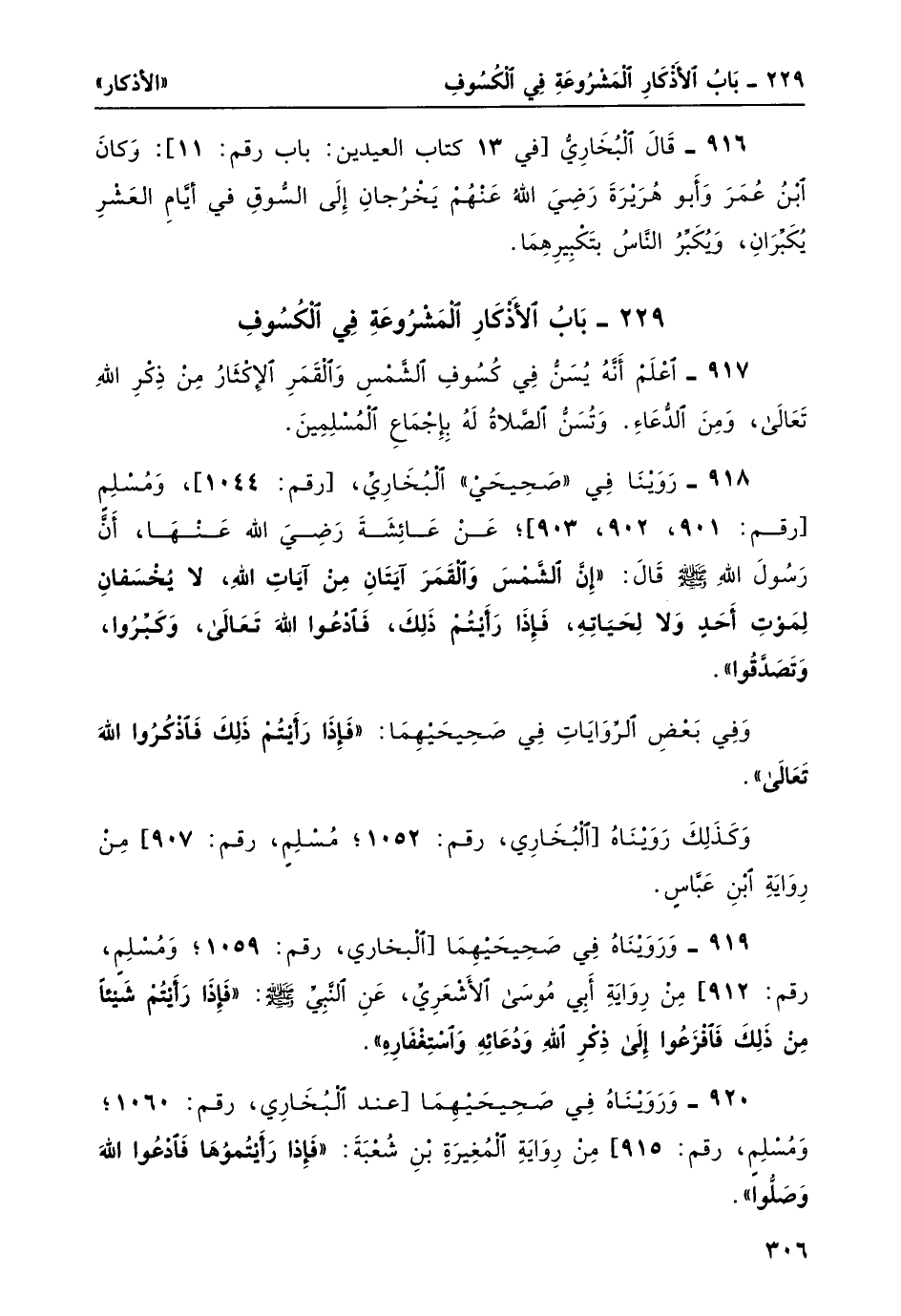 919- ورويناه في صحيحيهما [البخاري، رقم: 1059؛ ومسلم، رقم: 912] من رواية أبي موسى الأشعري، عن النبي صلى الله عليه وسلم: "فإذّا رأيْتُمْ شَيْئاً مِنْ ذلك فافْزَعُوا إلى ذكر الله ودعائه واستغفاره".